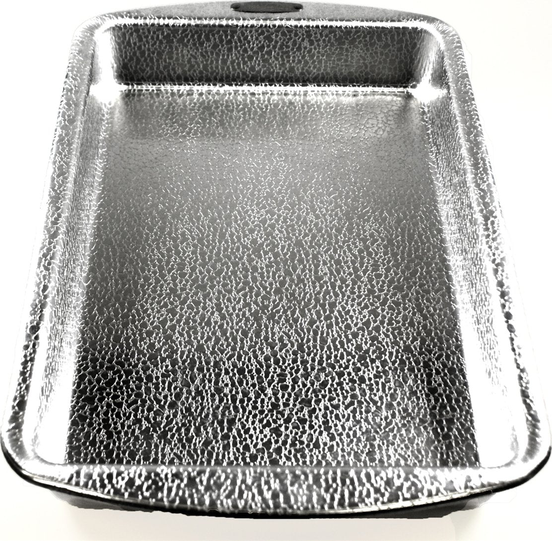 Made with a heavy gauge, recyclable aluminum. The patent, pebble pattern allows easy release.