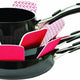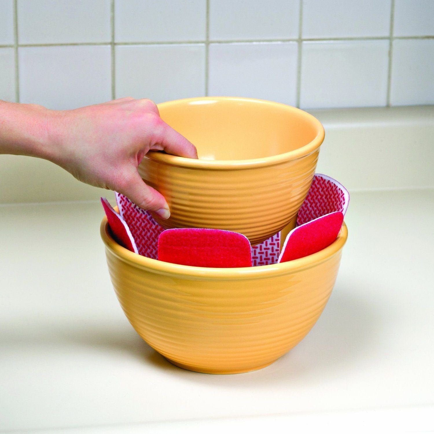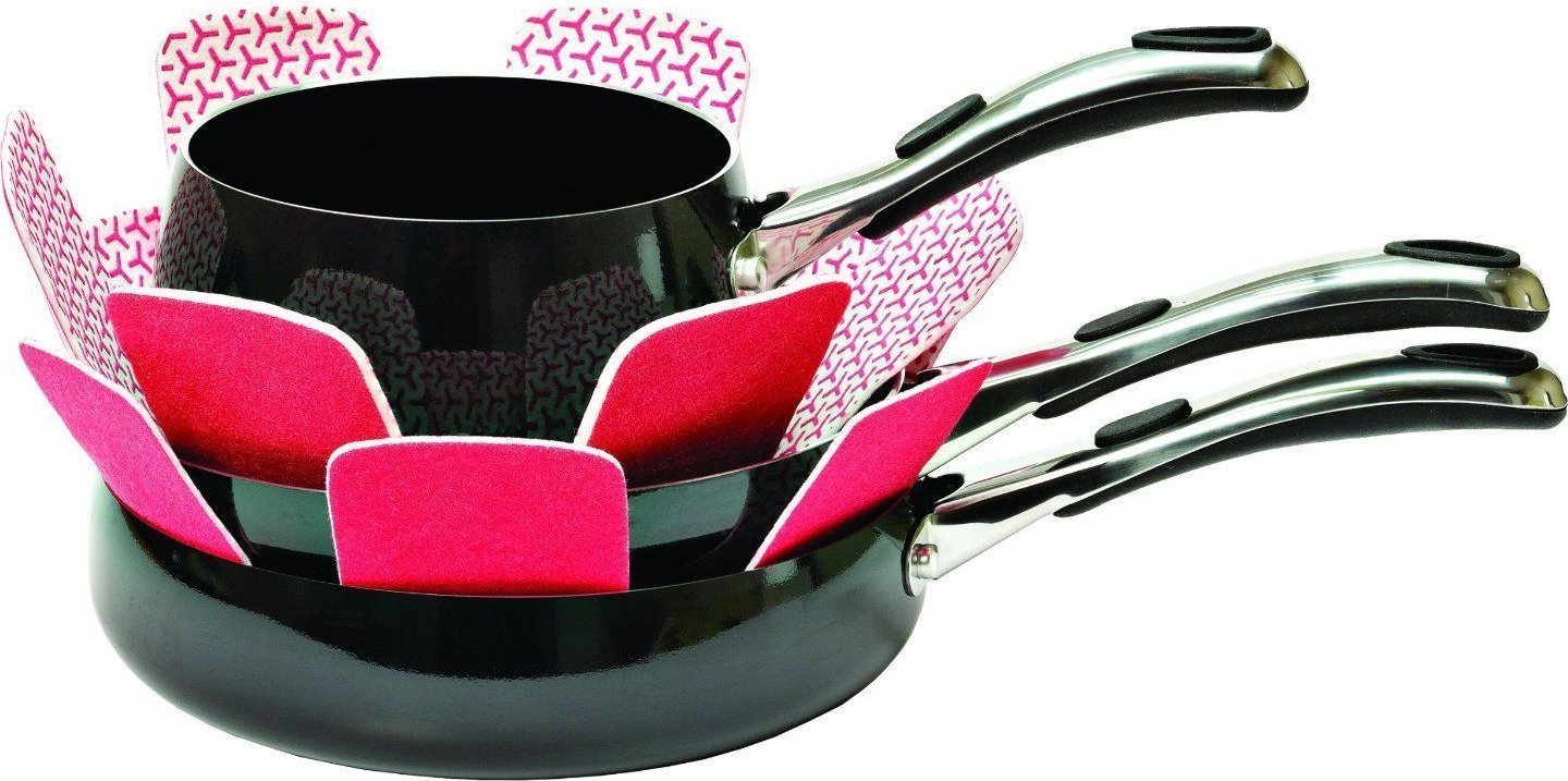 Protect your expensive nonstick, stainless and copper cookware from marks and scratches! The Envision Home Set of 3 Cookware Guards prevents pots, pans, bakers, and serving bowls from scratching and chipping when stored nested together. Prevent glass bowls and bakeware from "locking" together. The non-slip texture helps keep items from shifting when stored. Each pad is shaped like an asterisk to conform to any pan or plate, providing a non-slip, bulk-free cushion between any two pieces of cookware or tableware. The Cookware Guards also stop the loud clashing noise that occurs when taking pans out or putting them away.