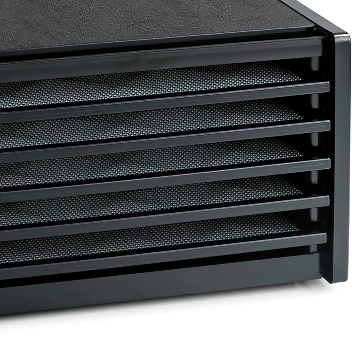 Dehydrate like a pro with the Excalibur 5-Tray Food Dehydrator. By making your own dehydrated foods, you can provide your family with all natural, healthy foods with no added sugars or preservatives. The 48-hour digital controller allows for two times and two temperatures to be set. The unit dehydrates at a range of 95 degrees Fahrenheit to 165 degrees Fahrenheit, the optimal drying temperature for herbs, fruit, meat and much more. The dehydrator comes with a clear polycarbonate door for easy view of drying and five plastic trays with enough room to dry a variety of foods. After loading food onto the trays, set the dehydrator at a higher temperature for a specified period of time, then set the dehydrator at a lower temperature for a specified period of time. The unit automatically adjusts after the first setting and turns off when the second setting is complete. Dehydrate fruits, vegetables, nuts, and meat for jerky, fruit puree for fruit roll-ups, raise bread or make homemade yogurt. Excalibur's patented Hyperwave technology and horizontal parallex drying remove water from food with a continuous circulation of thermostatically-controlled warm air. This black dehydrator has an 8-square-foot capacity and five-inch fan. Includes a free “Guide to Dehydration” and a free download for “Preserve It Naturally” so you can learn how to dehydrate all types of foods. Covered by the Excalibur 10-Year Limited Warranty.