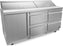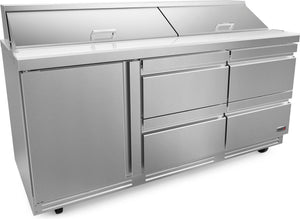 The Fagor 115V 18ft Single Door Refrigerated Salad/Sandwich Prep Table with Four Drawers is a top-of-the-line solution for efficient food preparation in commercial kitchens. Operating at 115 volts and spanning an impressive 18 feet in length, this prep table offers ample space to meet the demands of high-volume production. Its single-door refrigerated design ensures that ingredients are kept fresh and at optimal temperatures, maintaining quality and adhering to food safety standards throughout the preparation process. Specifically designed for salad and sandwich assembly, the prep table features a spacious top surface equipped with dedicated ingredient bins and compartments, facilitating an organized and streamlined workflow. With four drawers included, this unit provides extensive storage space for ingredients, utensils, and other kitchen essentials, promoting efficient organization and accessibility. Crafted from durable materials, the prep table is built to withstand the rigors of continuous use in busy kitchen environments.