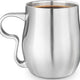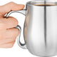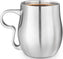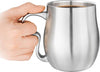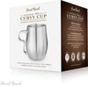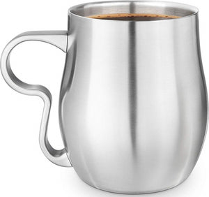 Enjoy long-lasting hot coffee in style with this double-wall stainless steel Curvy Cup. The double-wall construction provides superior insulation, enables hot beverages to stay hot longer and the exterior stays temperature-neutral; easy-to-handle. The contoured split-finger handle provides a secure grip & helps to prevent slips & spills. It is also designed to accommodate large or small hand sizes and the lower curve in handle cradles fingers for added support. Great for coffee, tea, or any other hot or cold beverages. This attractive cup is made from brushed stainless steel and features a solid-cast handle.