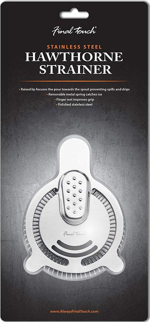 A perfect match for any cocktail shaker or mixing pitcher. Simply place this strainer on the top of the glass and use it to easily separate the ice from the cocktail. The raised lip focuses the pour towards the spout preventing spills and drips. While pouring, place your finger on the built-in finger rest for improved grip and the metal spring is removable making cleaning easy.