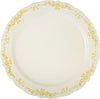 This Fineline 5910-BOG Heritage 10"" round bone / ivory plastic plate is sure to illuminate any tabletop presentation. Made of polystyrene plastic, this strong, and sturdy plate is perfect for wedding receptions and luncheons. While its ample diameter makes it great for serving entrees, its scalloped edge and intricate, gold detailing beautifully frame each dish and add a classic, vintage touch to table settings.