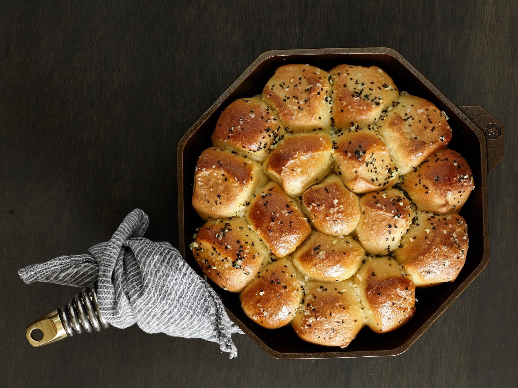 The polished, easy-to-release, near-nonstick cooking surface is simply cast iron & organic flaxseed oil. The patented octagonal shape makes it easier to release cornbread & each spout is another opportunity to pour stews without dripping on the table. Thicker castings optimize searing to seal in flavours. Ergonomic spring handles temper heat for an easier grip while cooking.