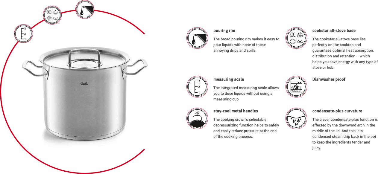 - Exclusive, energy efficient Fissler Cookstar® base for optimal heat distribution
