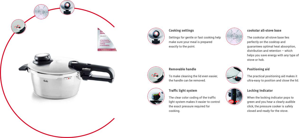 - Exclusive, energy efficient Fissler Cookstar base for optimal heat distribution