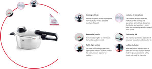 Demanding home chefs will appreciate the innovative features and four precision cooking settings that make the Vitavit Premium stand out from other stovetop pressure cookers. Fissler has incorporated more than 65 years of experience and engineering to create this commercial-grade pressure cooker. It not only reduces cooking time by up to 70% but can also steam, sear/brown, multi-level cook, preserve, sterilize, and even bake! The four settings and unique traffic light system offer unbeaten precision and complete control of the cooking process. Once sealed, the safety systems are activated, and the pot can’t be opened unless excess pressure is released. Main body is constructed of premium 18/10 stainless steel that is durable and easy to clean.