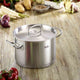 The 5.5 quart Original-Profi high stainless-steel stock pot which is also suitable for induction cooktops, is an ideal helper on those days when you want to cook more than the usual amount. The tight-fitting lid with the innovative Condensate-Plus function lets condensation drip from the center of the lid onto the food.