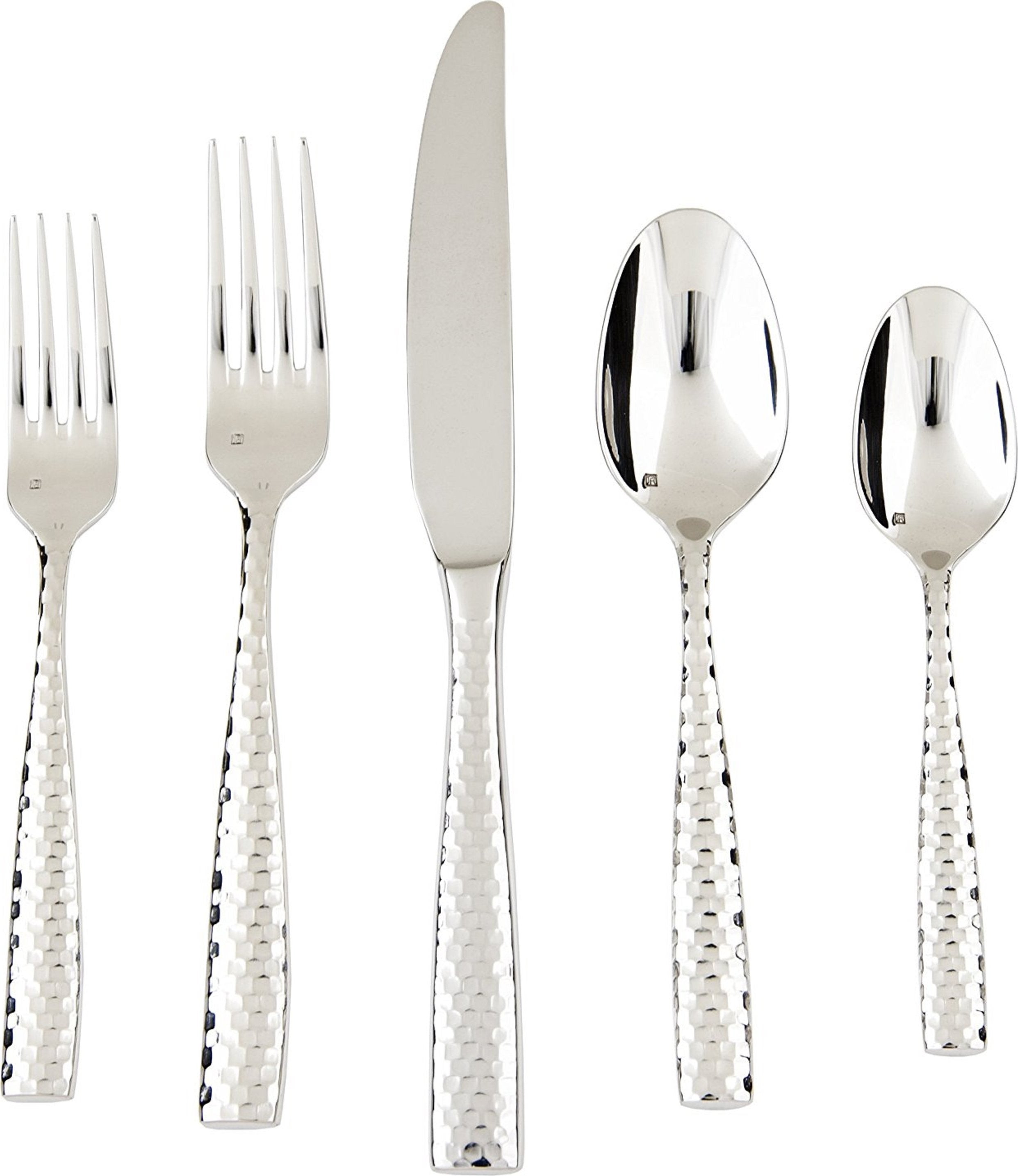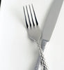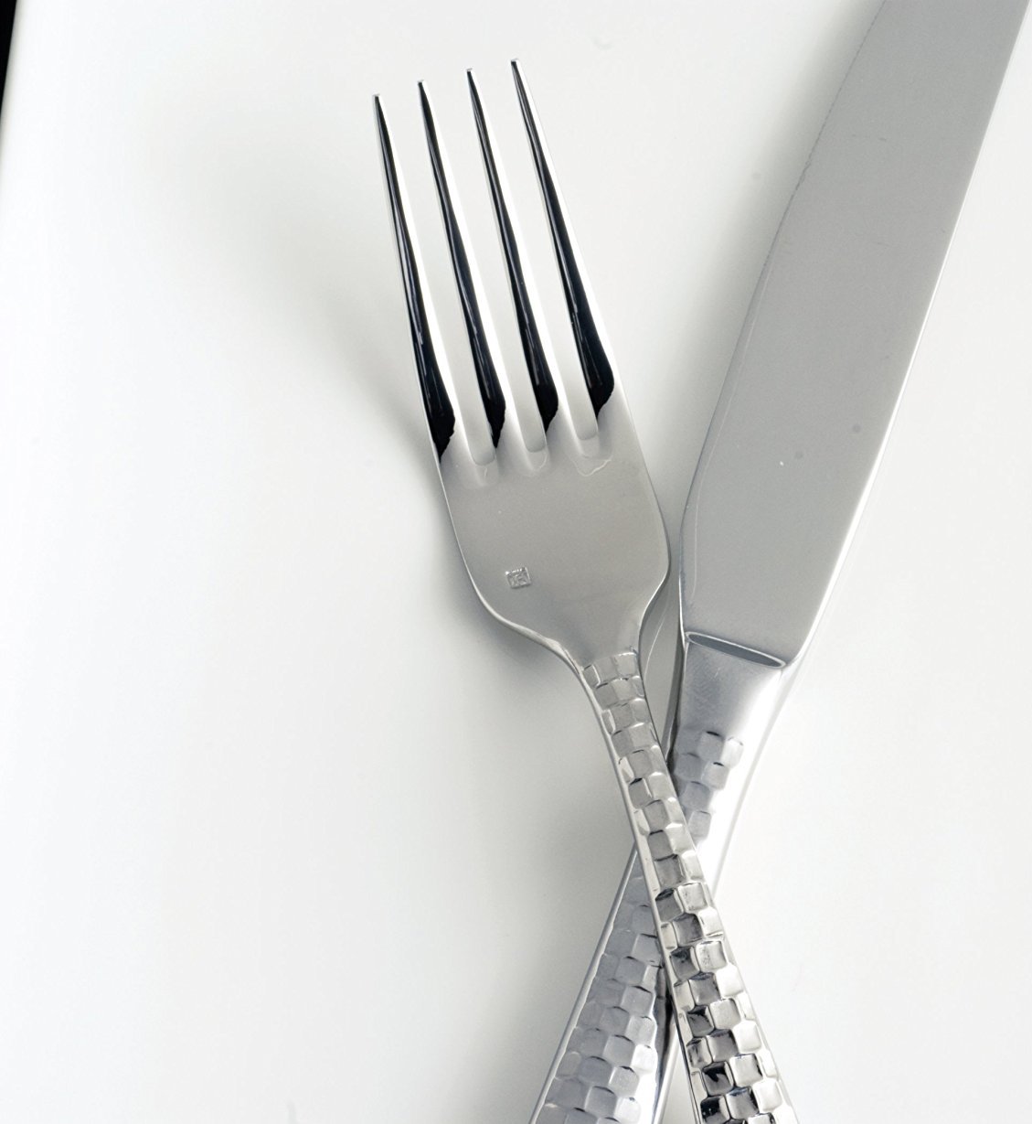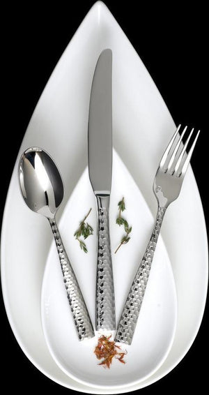 A variation of one of our most popular design, this faceted version provides an improved grip and textural detail. Perfect for your formal dinning room or your patio buffet. Set includes: 4 table forks, 4 salad/dessert forks, 4 table knives, 4 dessert/soup spoons and 4 coffee/tea spoons.