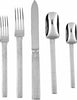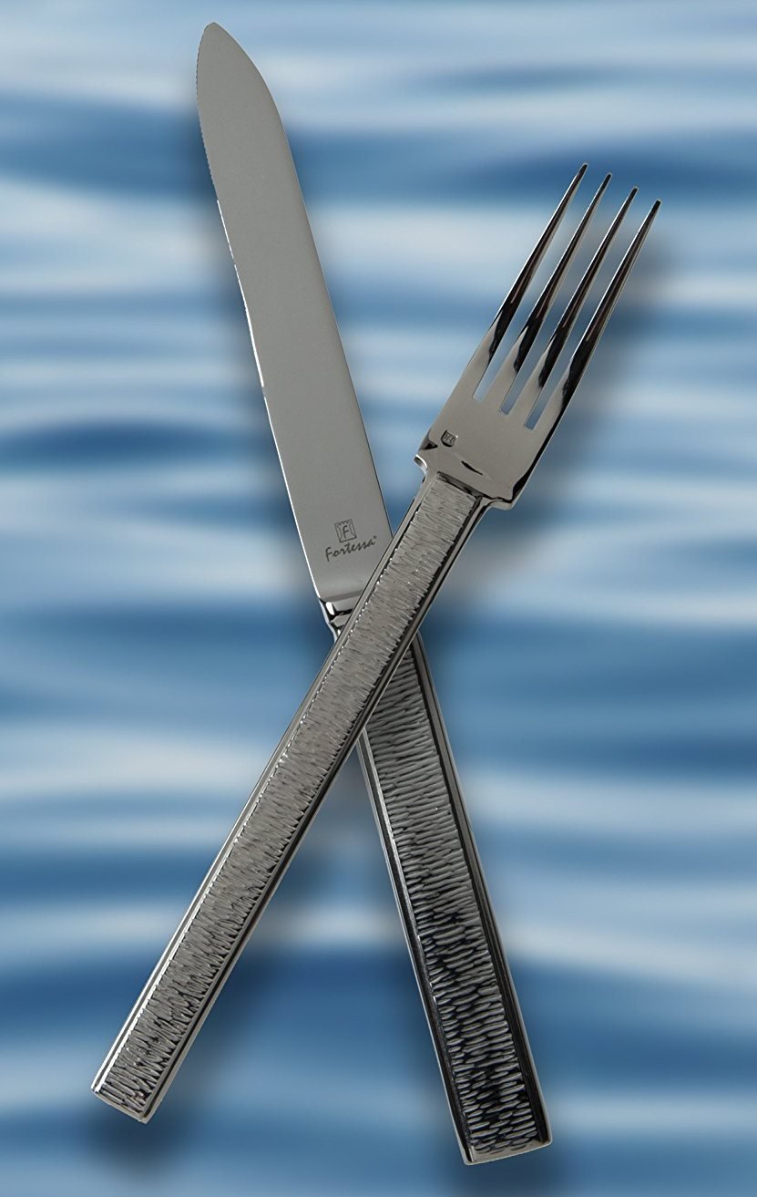 This distinctive modern design adds drama to your table setting and brings a welcome joie-de-vivre to any culinary aficionado. The Fortessa Acqua stainless steel flatware pattern is modern and unique. The Acqua silverware pattern features textured handles with a square end, pointed knife blades and rectangular spoon bowls. Each 5 piece set includes a table fork, salad/dessert fork, table knife, dessert/soup spoon, and a coffee/ tea spoon.