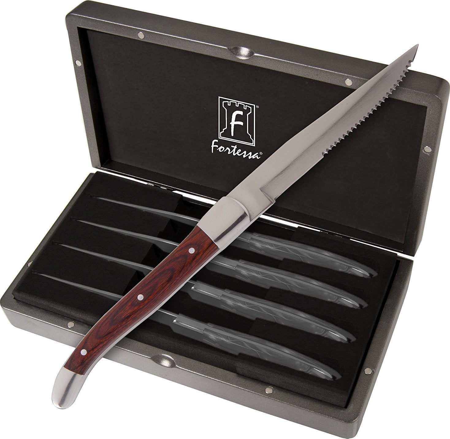 Complete your flatware collection with matching or contrasting steak knives. Fortessa steak knives are found in the upper end steak and chop houses throughout America. Restaurant durability and elegantly designed, this style compliments your table at an everyday price. Fortessa steak knives are high-quality and are made of fine 18/0 stainless steel. If you are a beef eater, you will love having the Fortessa restaurant-quality steak knife. Set includes: 4 serrated steak knives with dark wood handles.