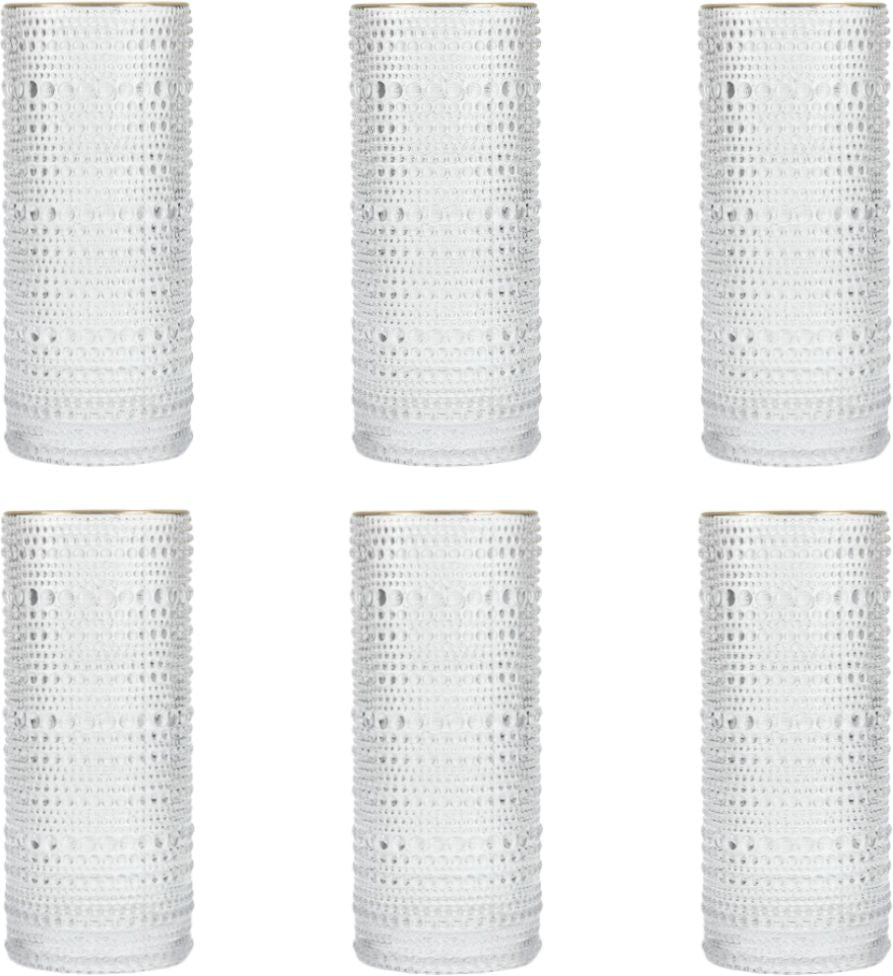 Bring timeless elegance and a pop of color to your table with the Fortessa Jupiter 10.8 oz. Clear Collins/Highball Glass with Gold Rim. Featuring a stunning hobnail design inspired by Parisian flea market finds, this glass is adorned with delicate beaded detailing, adding sophistication to any setting. Perfect for serving mojitos, cocktails, water, juice, or any beverage, these versatile glasses are a must-have for cocktail enthusiasts and those looking to enhance their drinkware collection. Made from durable soda-lime-silica with magnesium oxide and alumina, this glassware offers beauty, functionality, and resilience. Its dishwasher-safe design makes it ideal for both everyday use and special occasions.