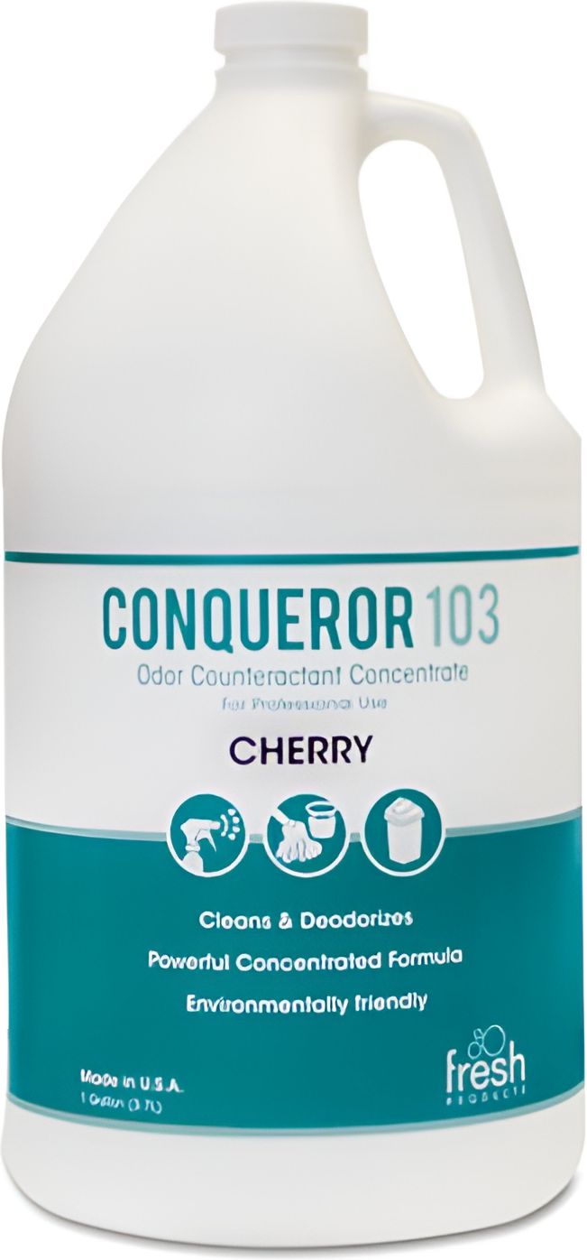 The Conqueror 103 Air Fresh Deodorizer offers powerful and long-lasting performance, helping you maintain a fresh-smelling environment for an extended period. Its effective formula neutralizes and eliminates unpleasant odors, rather than masking them, for a more thorough and lasting freshness. With its convenient 1-gallon size, the jug provides a generous amount of deodorizer, ensuring you have an ample supply to tackle odor problems. Simply apply the deodorizer using a sprayer or as directed on the packaging, and enjoy the transformation of your space into a cherry-scented haven. Conquer unwanted odors with the Conqueror 103 Air Fresh Deodorizer in Cherry Scent. Whether it's in your home, workplace, or any other setting, this powerful deodorizer will help you create a more pleasant and inviting atmosphere. Say goodbye to unpleasant smells and embrace the delightful fragrance of cherries, making your space a more enjoyable place to be.