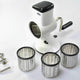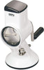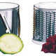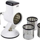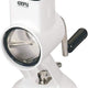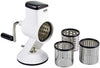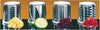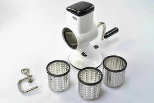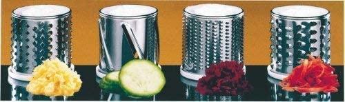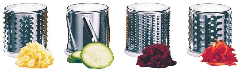 With four different stainless steel drums for fine grating, coarse grating, slicing and chipping. With suction cups and screw clamps for safety.