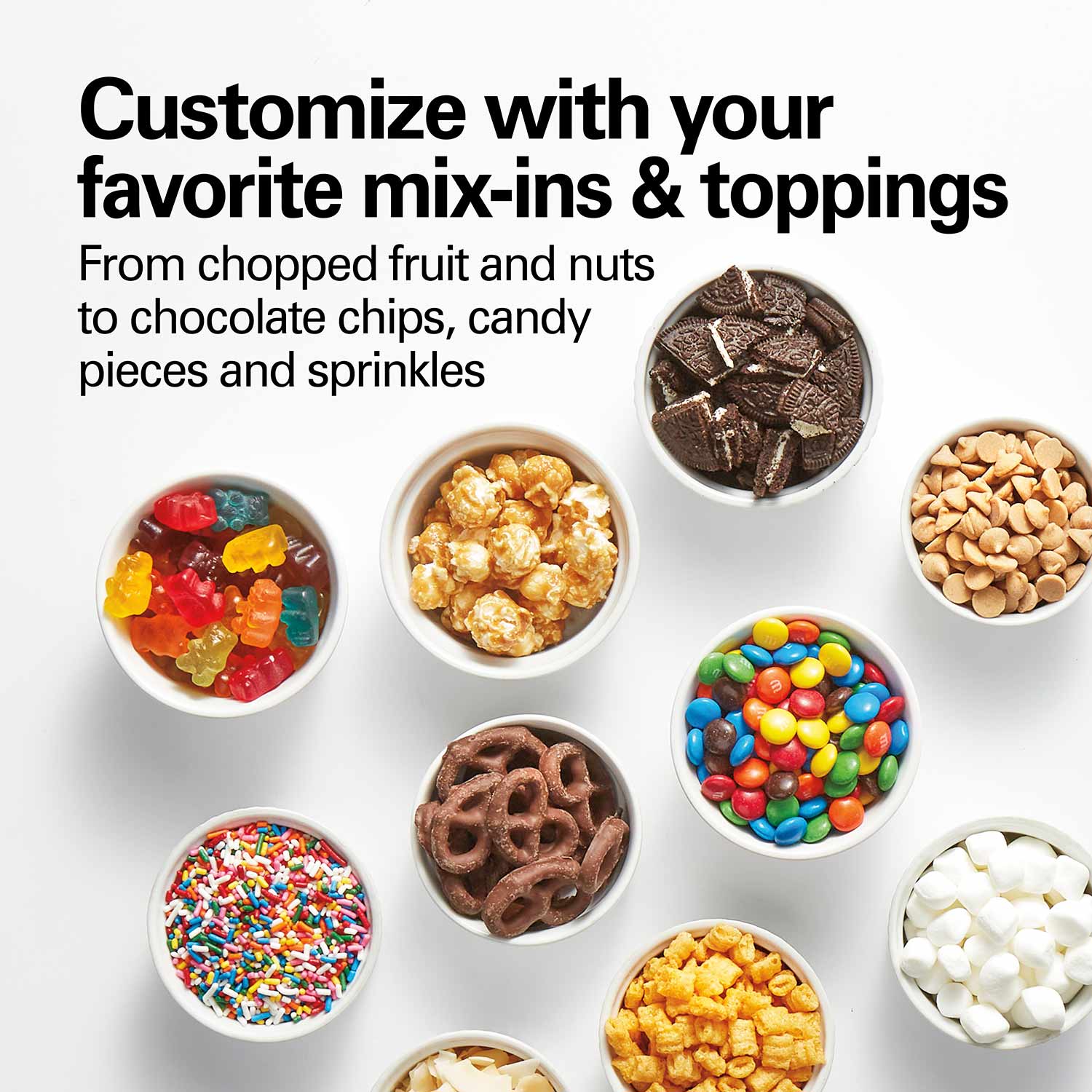 Customize with Mix-Ins and Toppings: Add your favorite ingredients like chopped fruit, nuts, chocolate chips, candy pieces, and sprinkles to create your perfect ice cream.