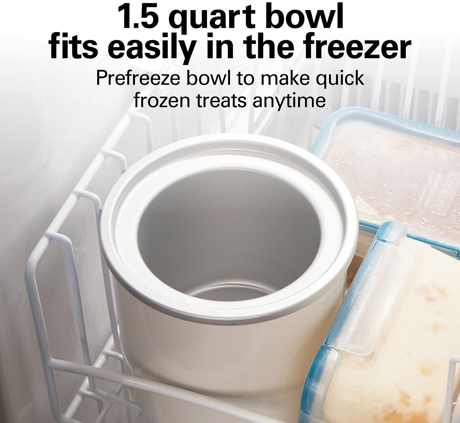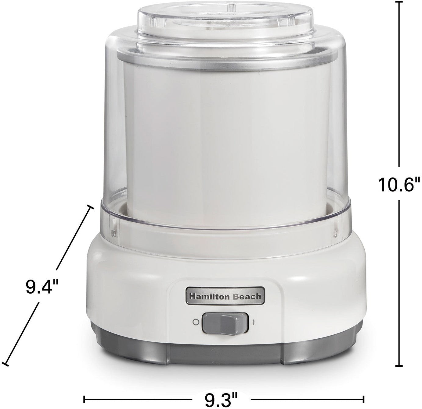 With the Hamilton Beach® 1.5 Quart Ice Cream Maker, creating homemade ice cream, frozen yogurt, sorbet, sherbet, and gelato is a breeze. Enjoy your favorite frozen treats in as little as 20 minutes without the need for rock salt or hand churning. Use your own fresh ingredients and customize your creations with your favorite mix-ins and toppings. This ice cream maker is perfect for parties, gatherings, and family fun, making delicious desserts quickly and easily. The Hamilton Beach 1.5 Quart Ice Cream Maker makes it easy to create delicious homemade ice cream and other frozen treats in just three simple steps. With no rock salt or hand churning needed, you can enjoy fresh, customized desserts quickly and easily. The included freezer bowl fits conveniently in your freezer, so you're always ready to make a sweet treat. Perfect for any occasion, this ice cream maker will be a hit at parties and family gatherings.
