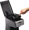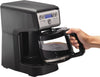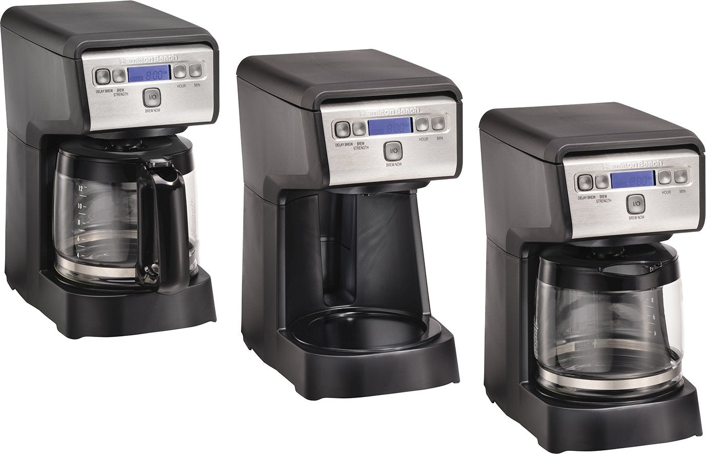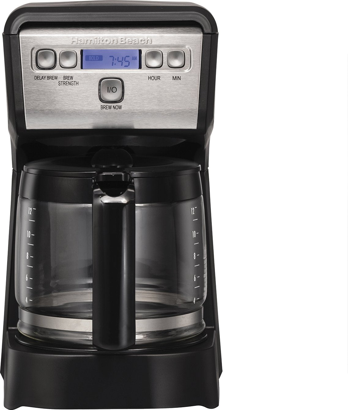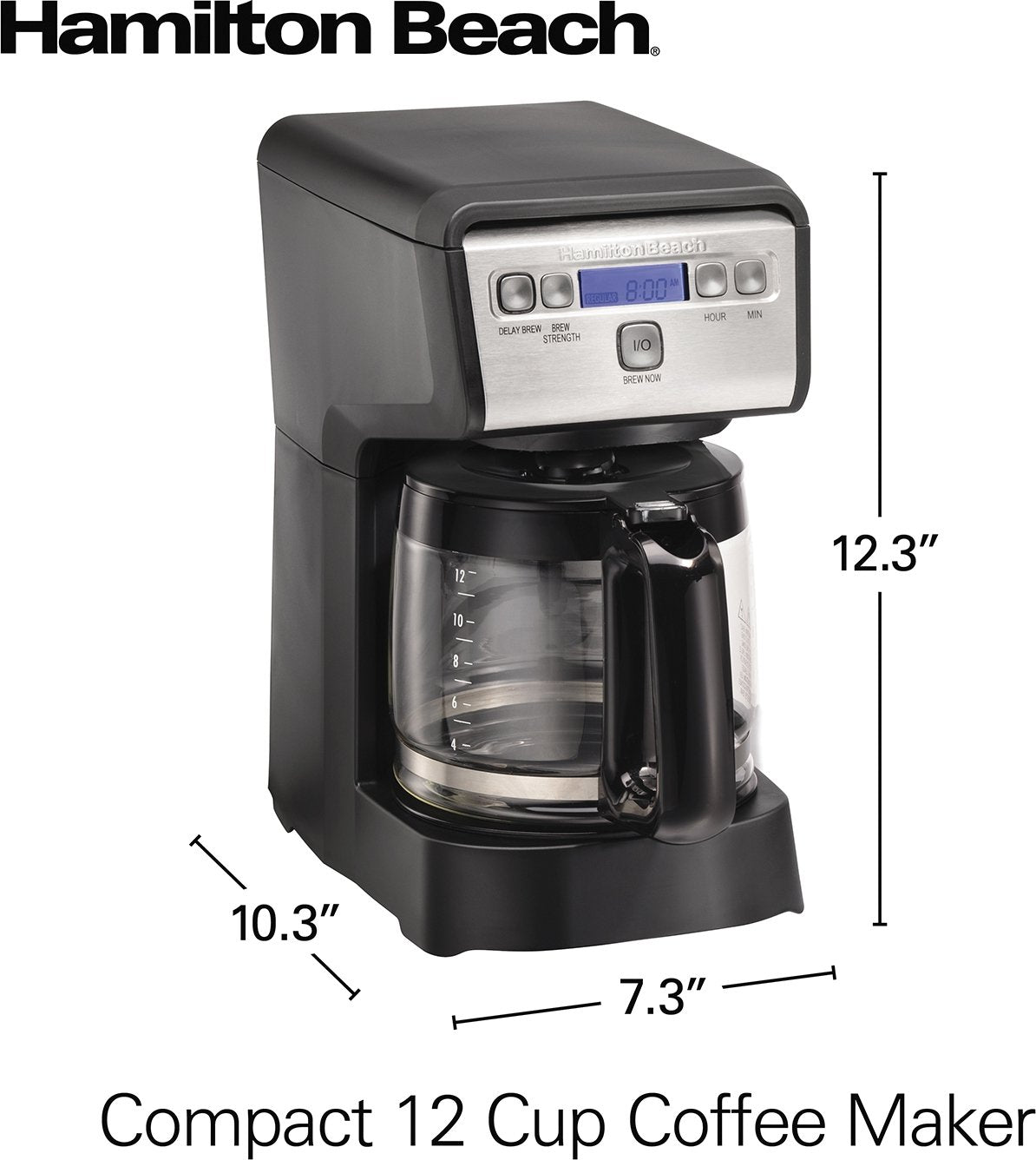 The Hamilton Beach 12 Cup Compact Programmable Coffee Maker is a large-capacity coffee maker nestled in a small compact design packed with features. It's perfect for small kitchens or any place where you'd like to conserve space. It easily fits under kitchen cabinets with room to spare, and features top-mounted controls that are easier to see and use. Programming is simple, too. Easy-Touch programming lets you set the coffee maker up to 24 hours ahead for fresh, hot coffee when you wake in the morning. Customize the strength of your coffee to suit your tastes with the Select-a-Brew brew-strength selector. Auto pause and pour stops the flow of coffee when you lift the carafe away from the coffee maker to pour a cup of coffee before the brewing stops without making a mess. The coffee maker automatically turns off after 2 hours for added peace of mind. The 12 cup glass carafe holds plenty of coffee for serving a large family or group. It's designed for mess-free, easy pouring. And the transparent water-level window has clear level markings so you can easily see how much water you've added. The sleek black and stainless steel design complements any decor.