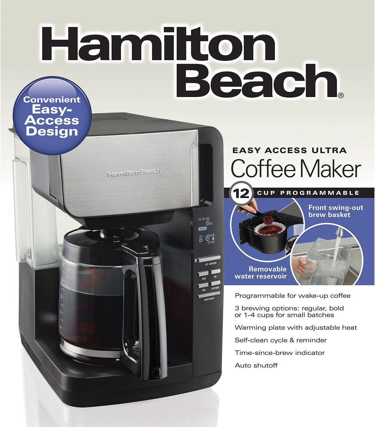 Discover the convenience and versatility of the Hamilton Beach 12 Cup Programmable Ultra Coffee Maker, designed to fit seamlessly into your daily coffee routine with advanced features and easy-access design. The Hamilton Beach 12 Cup Programmable Ultra Coffee Maker is designed for convenience and functionality, featuring a front-access brew basket and side-access water reservoir. This innovative design eliminates the need to move the coffee maker for refills, making it ideal for kitchens with limited space or under-cabinet placement. Enjoy flexible brewing options with regular, bold, or 1-4 cup settings, ensuring your coffee is brewed to your preferred strength whether you're making a full pot or just a few cups. The programmable clock and timer allow you to wake up to freshly brewed coffee, while the "time since brew" indicator lets you know how long your coffee has been sitting. The adjustable warming plate keeps your coffee at the perfect temperature, and the automatic pause and serve feature lets you pour a cup mid-brew without spills. Cleaning is hassle-free with a self-clean cycle and dishwasher-safe brew basket, ensuring your coffee maker stays in top condition. The large, ergonomic handle on the removable water reservoir makes it easy to refill without spills, enhancing user convenience.