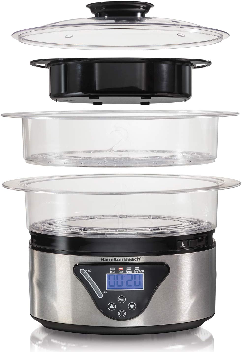 Make mealtime more exciting and your plate more nutritionally balanced with colorful, vitamin-packed foods. It’s easy with the Hamilton Beach® Digital Steamer. Add your choice of vegetables, seafood, or chicken breasts and you’re minutes away from serving a satisfying steamed meal the whole family will enjoy. With a Food Steamer in your kitchen, you can take advantage of the bounty of healthy, in-season produce at your local farmer’s market or grocery store. If you’re lucky enough to have your own garden, you can reap the rewards and the satisfaction of steaming your own freshly picked vegetables. Once you add gently steamed vegetables and seafood to your meal rotation, canned and frozen foods lose their appeal. Don’t be surprised if the Digital Steamer earns a permanent place on your kitchen counter because it’s so versatile and easy to use. Fill it with water, place one or two of the transparent bowls filled with food atop the base and set the cooking timer. You’re free to complete other tasks as food steams, because when your food is ready, it sounds a beep and automatically switches to warm for one hour.