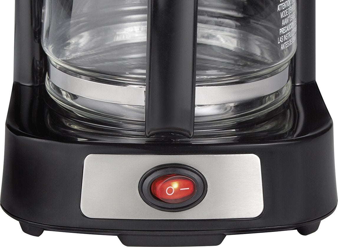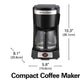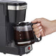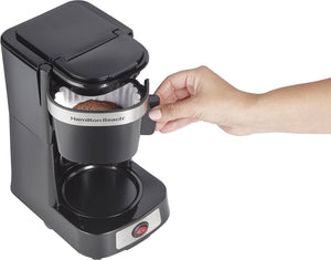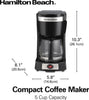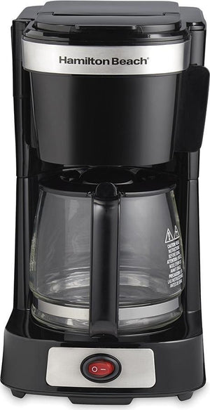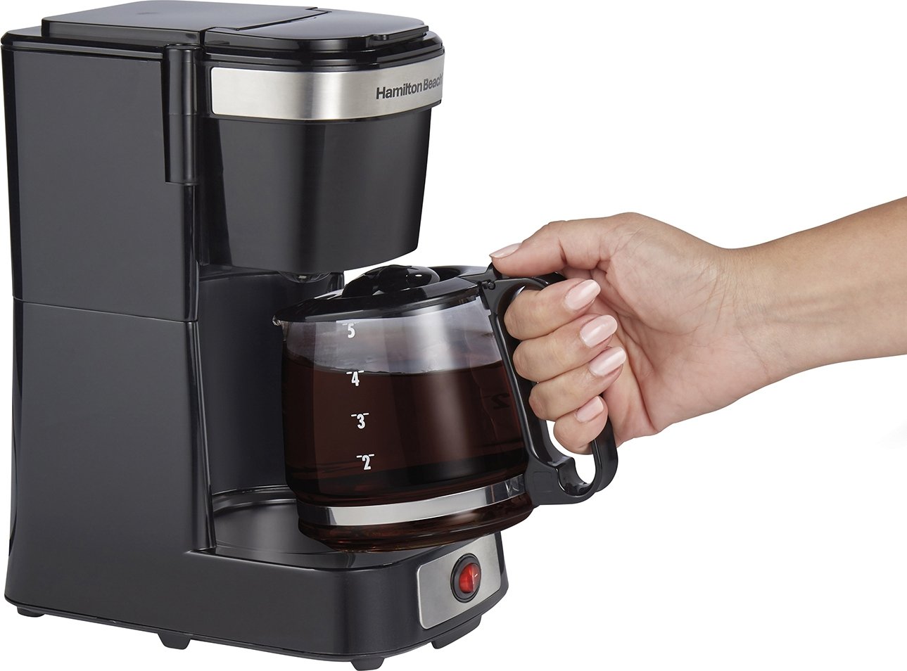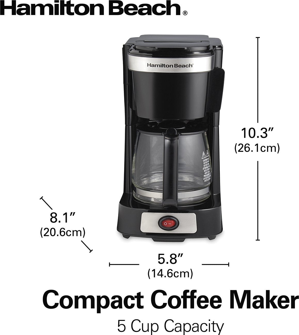 The Hamilton Beach 5 Cup Compact Coffee Maker with Glass Carafe features a compact design, while making the perfect amount of coffee for your everyday needs. It's perfect for small apartments and kitchens, and is packed with many great features you'd expect to find in a full-size coffee maker. Since you only brew what you need, coffee waste is reduced. Because of the compact design, this coffee maker easily fits under kitchen cabinets and is ideal for any place where you'd like to conserve counter space. The sleek black and stainless steel design also complements any kitchen decor. The front-fill water reservoir and swing-out brew basket make it easy to add water or coffee grounds to the coffee maker, which is simple and straightforward to use with the push of a button. The AutoPause & Pour feature stops the flow of coffee when you lift the carafe away from the coffee maker so you can pour a cup of coffee before the brewing stops without making a mess. This coffee maker is easy to keep clean, with a Lift & Clean brew basket that easily removes for washing in the dishwasher.