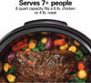 Serves 7+ People with 6 Quart Capacity: Prepare meals for the whole family or a large gathering with ease. The 6 quart capacity of this slow cooker accommodates large cuts of meat, whole chickens (up to 6 lbs), or generous servings of stew, soup, and more.