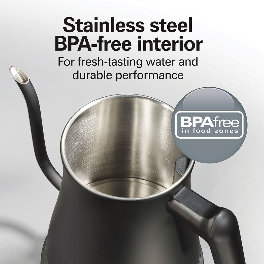 Experience precision pouring and rapid heating with the Hamilton Beach Compact Gooseneck Kettle, perfect for a variety of hot beverages and meals. The Hamilton Beach Compact Gooseneck Kettle enhances your daily hot beverage preparation with its precise pouring capability and rapid heating technology. Whether you're brewing a delicate pour-over coffee or preparing a quick cup of tea, the gooseneck spout ensures controlled, even pouring every time. Boasting 1200 watts of power, this kettle heats water swiftly—faster than a microwave—and offers a safer alternative to stovetop kettles. Simply fill the kettle, plug it in, and press the switch near the base to start heating. The kettle automatically turns off and illuminates its indicator light once the water boils, providing convenience and peace of mind. Compact in size, this kettle holds up to 0.6 liters (20 oz.) of water, making it perfect for 1-2 servings without unnecessary waste. Its stainless steel, BPA-free interior ensures water tastes fresh and free from harmful chemicals, enhancing your overall beverage experience. Enjoy the freedom of cord-free serving as the kettle easily lifts off the base, allowing you to pour and serve at the table or wherever you prefer to enjoy your hot beverages. After use, the cord wrap under the base keeps your countertop tidy and the kettle neatly stored until next time.