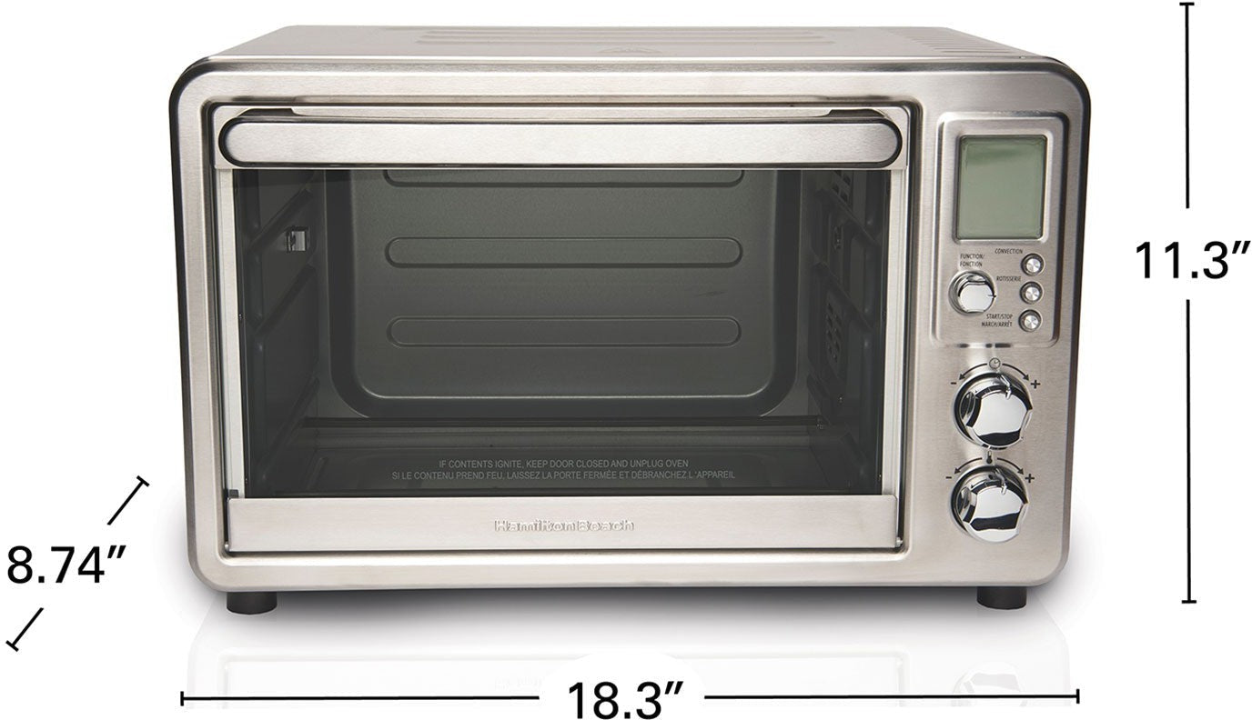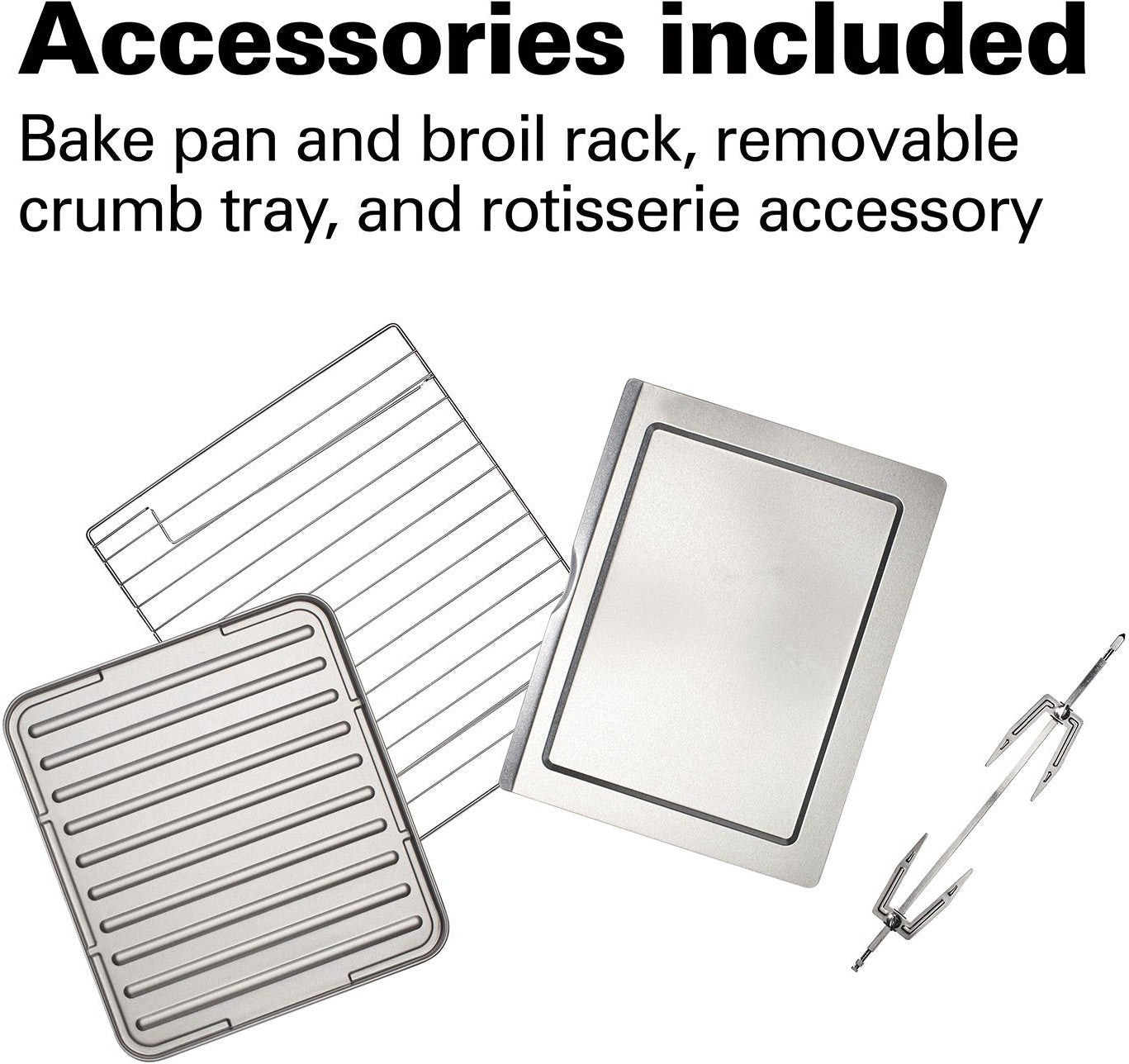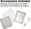 - Includes bake pan, broil rack, rotisserie accessories, and removable crumb tray