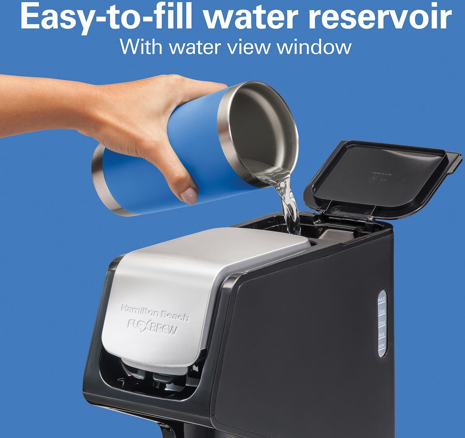 Enjoy the ultimate in coffee brewing flexibility with the Hamilton Beach® FlexBrew® Single-Serve Coffee Maker. This innovative machine allows you to brew your favorite coffee using either K-Cup®* pods or ground coffee, all while saving valuable counter space with its slim design. The Hamilton Beach FlexBrew Single-Serve Coffee Maker offers the convenience of brewing coffee in two ways, allowing you to choose between K-Cup®* pods or coffee grounds. This single-serve coffee maker brews an 8 oz. cup of coffee in about 2 minutes, making it ideal for those who need a quick caffeine fix. With a compact design that measures less than 5 inches wide, this coffee maker saves valuable counter space and fits easily in any kitchen. The touch-sensitive controls are user-friendly, letting you select between regular and bold brew strengths with a simple tap. The 14 oz. water reservoir is easy to fill and has a water view window, ensuring you brew the perfect amount every time. The removable cup rest accommodates both standard-size cups and 7-inch tall travel mugs, and includes a convenient storage area for the pod holder or single-serve brew basket.