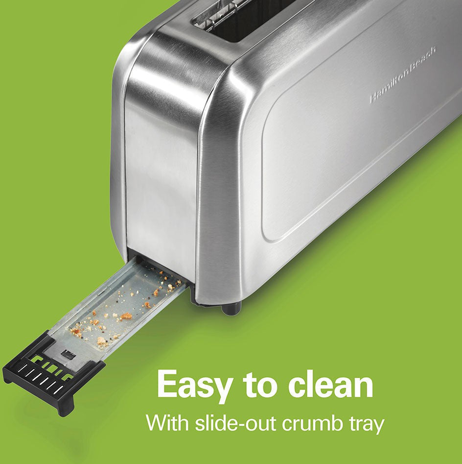Introducing the Hamilton Beach® Long-Slot Toaster, designed with a modern, slim profile that fits perfectly into narrow spaces while adding a touch of elegance with its stainless steel finish. Its standout feature is the extra-long, extra-wide 10" slot, ideal for toasting two regular slices of bread or one long slice of artisan bread without the need for cutting or flipping. Enjoy perfectly toasted bagels with the dedicated bagel button, which extends toasting time to ensure warm and delicious results every time. The toaster's Toast Boost feature lifts smaller breads like English muffins and gluten-free slices higher after toasting, making them easier to retrieve without burns. Achieve your preferred toast shade effortlessly with the shade selector offering 7 browning levels. The toaster includes a cancel button for stopping the toasting cycle at any moment, and for added safety, it features automatic shutoff at the end of each cycle, even if toast becomes stuck. Cleaning is hassle-free with the slide-out crumb tray that collects crumbs, preventing them from littering your kitchen countertop. The toaster's compact design and integrated cord storage ensure easy storage when not in use. The Hamilton Beach Long Slot Toaster combines sleek aesthetics with practical functionality, making it an essential addition to any kitchen seeking style and efficiency in toasting.