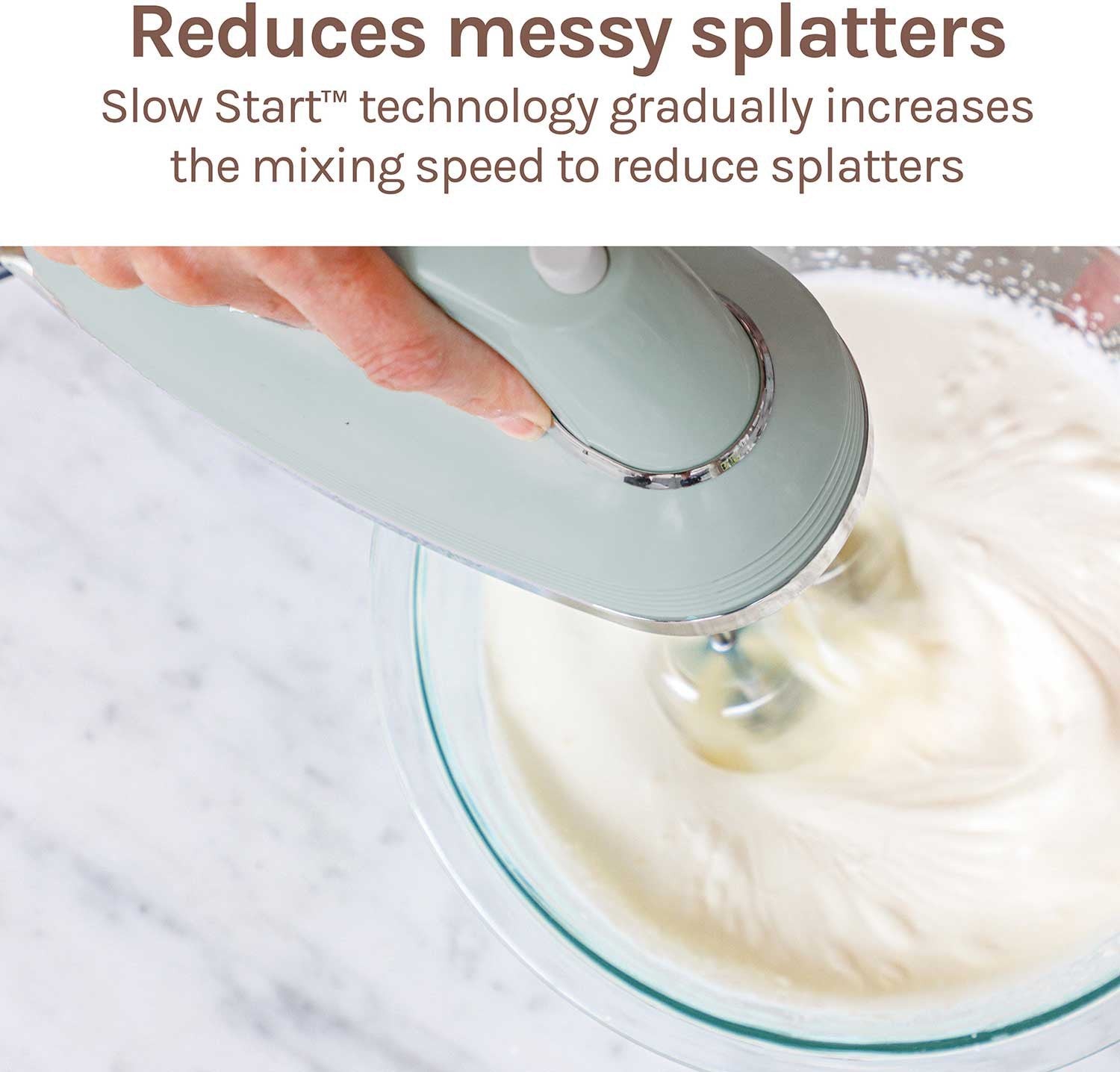 Reduces Messy Splatters with Slow Start™ Technology: The mixer’s starting speed is nearly half as slow as a traditional mixer, allowing you to add ingredients gradually and prevent messy splatters.