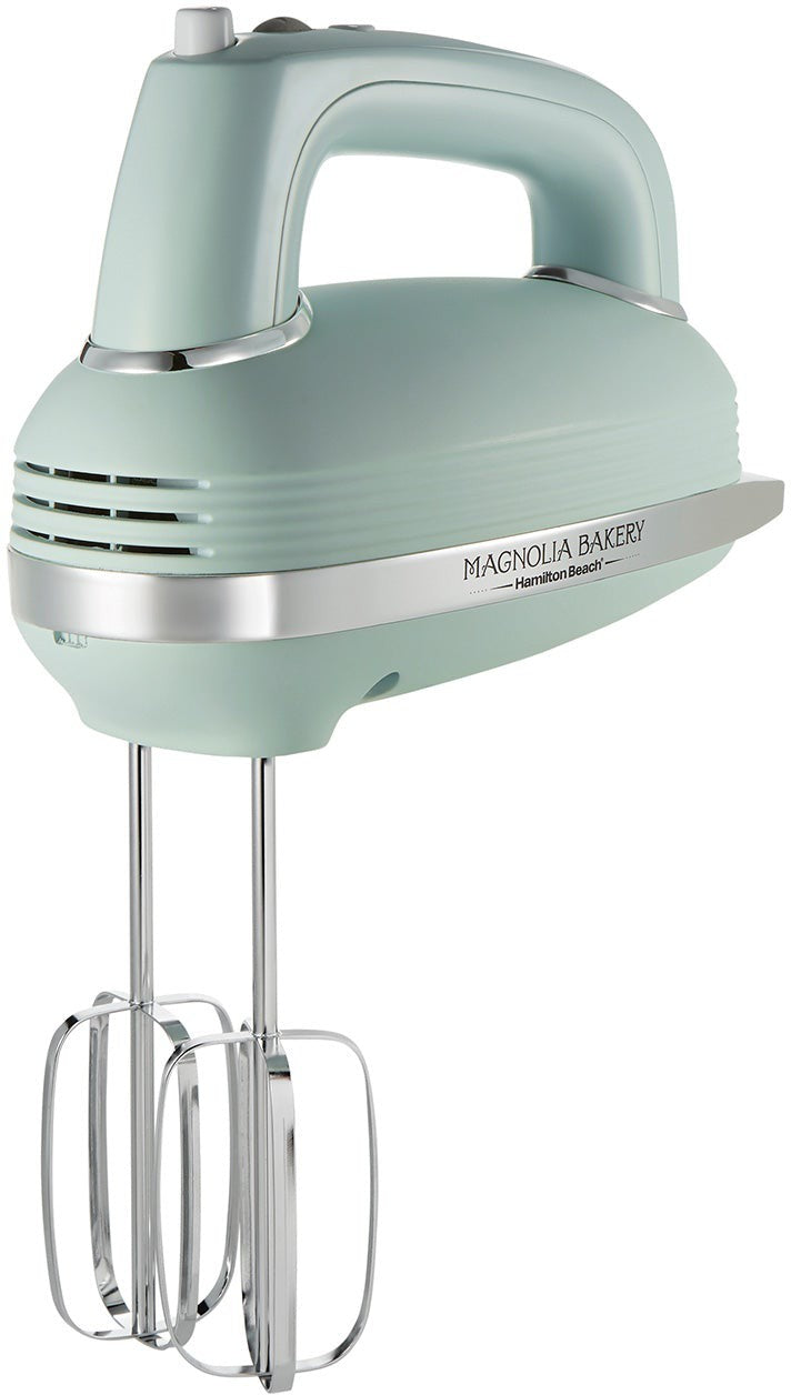 Celebrate the nostalgic charm of Magnolia Bakery with the Hamilton Beach® Magnolia Bakery 5 Speed Hand Mixer in Magnolia Green. Designed for effortless mixing, this hand mixer features powerful performance, convenient storage, and vintage style. Perfect for making Magnolia Bakery’s iconic desserts or your own favorite recipes, this mixer brings professional-grade quality to your kitchen. Since opening their first shop in New York City’s West Village in 1996, Magnolia Bakery has become a beloved name in American desserts, known for their fresh-baked goods and nostalgic charm. With the Hamilton Beach Magnolia Bakery Hand Mixer, you can easily recreate their iconic treats at home. The mixer’s vintage-style design is both charming and functional, featuring a powerful DC motor for effortless mixing and Slow Start™ technology to reduce splatters. The included snap-on storage case keeps the attachments neatly organized, so you’ll never lose a beater again. With 5 speeds and a QuickBurst™ button, this versatile hand mixer can handle every mixing job, from light and airy batters to thick doughs. The lockable swivel cord and Bowl Rest™ feature add convenience and ease of use, making this mixer a must-have for any baking enthusiast.