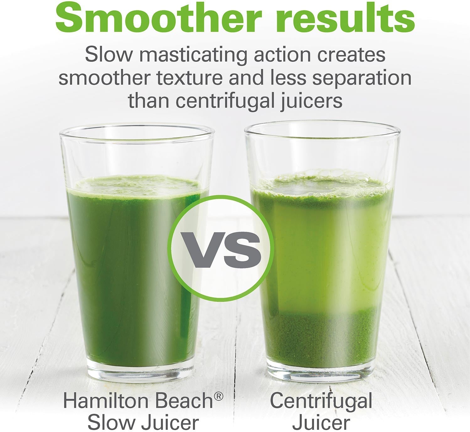 Enjoy fresh, healthy cold-pressed juice with the Hamilton Beach Masticating Slow Juicer. This versatile appliance effortlessly transforms a variety of fruits and vegetables into nutritious juice, making it easy to meet your daily recommended intake of vitamins and minerals. The slow masticating action of the durable Tritan™ auger, driven by a 150 watt motor, operates quietly to extract maximum juice yield with minimal noise. It's designed to extract twice as much juice from leafy greens compared to centrifugal juicers, ensuring you get the most out of your produce. Experience smoother juice with less separation, thanks to the slow masticating process that preserves nutrients and flavor. The included 24 oz. BPA-free juice cup features a froth separator, ensuring foam-free pouring for a clear, enjoyable glass of juice. Cleanup is simple with dishwasher safe parts, including the pulp bin, juice bowl, lid, and pusher. A strainer cleaning brush is also included for added convenience. Backed by Hamilton Beach, America's #1 juice extractor brand, this masticating juicer comes with a 3-year limited warranty for peace of mind.