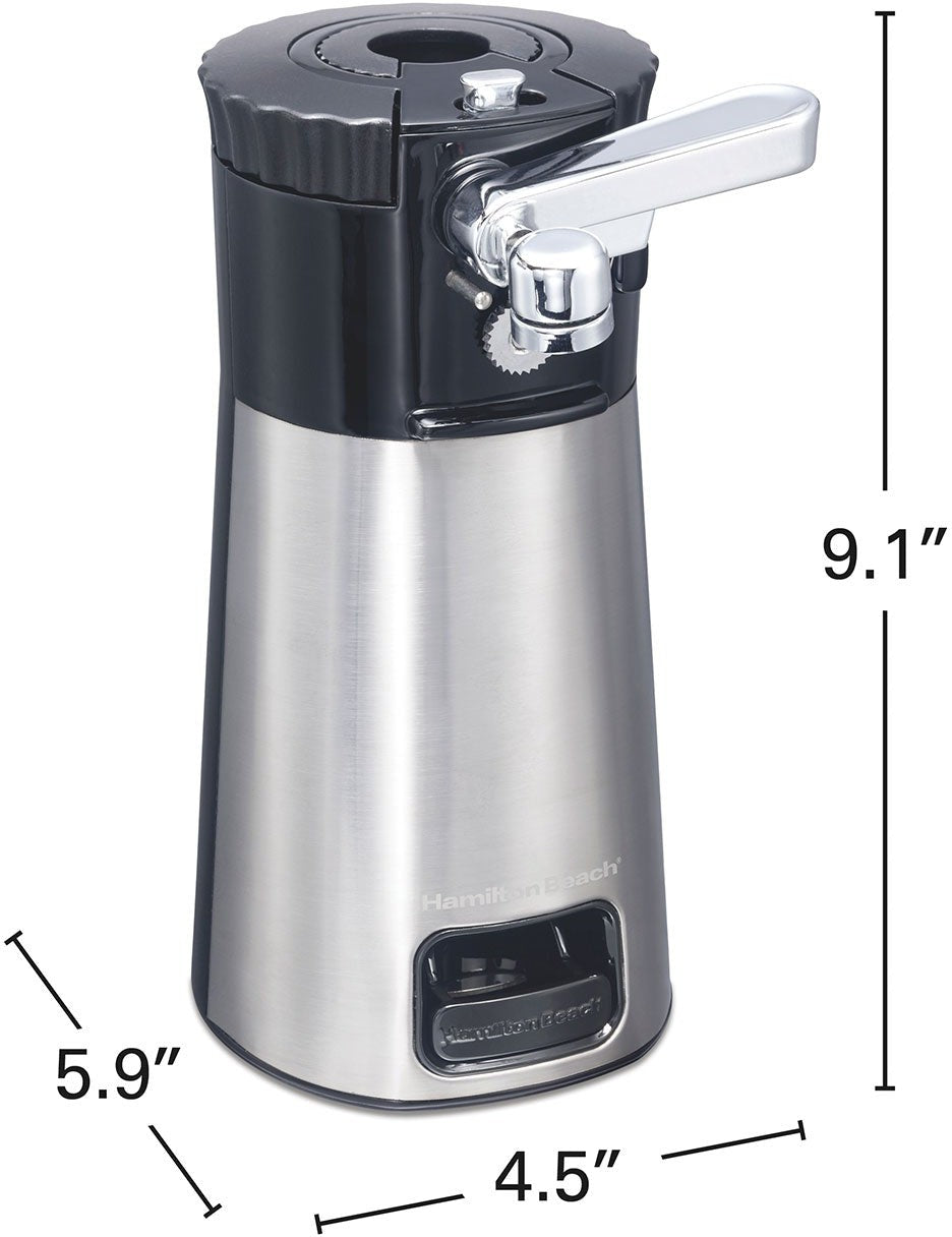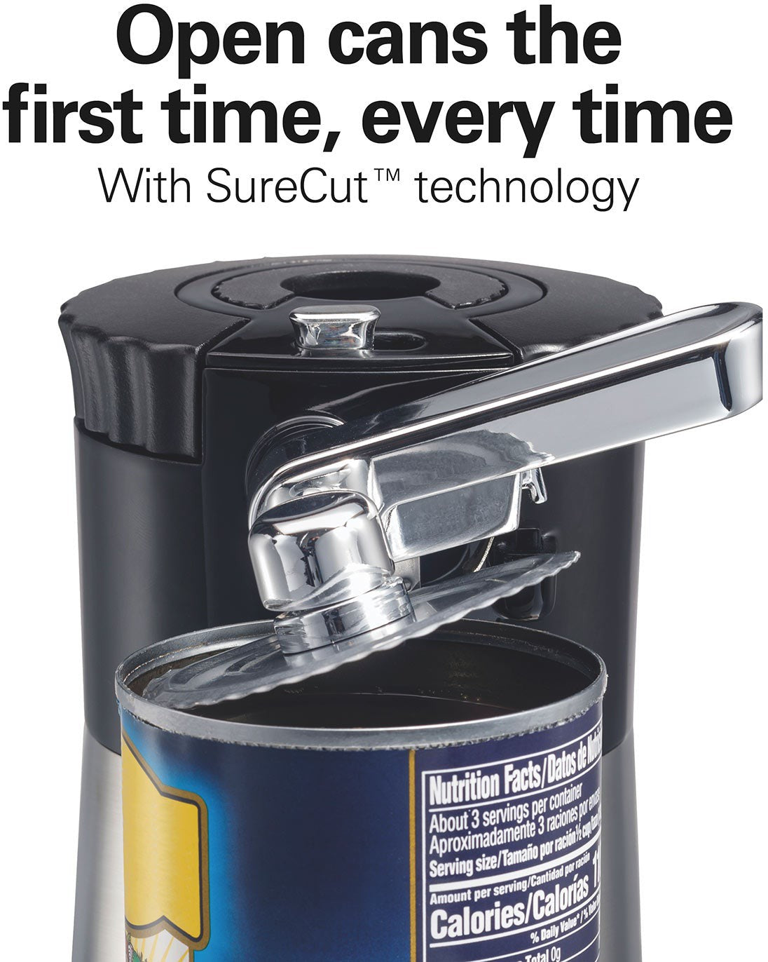Effortlessly open cans and more with the Hamilton Beach OpenStation™ Can Opener, featuring Sure-Cut™ technology for reliable performance. The Hamilton Beach OpenStation™ Can Opener with Tools simplifies kitchen tasks with its multifunctional design. Equipped with SureCut™ technology, it ensures cans open effortlessly on the first attempt, saving time and frustration. The integrated OpenMate™ Multi-Tool handles various tasks like opening hard plastic packages, pop-top cans, and removing bottle tops and twist-off caps. This tool conveniently stores in the front of the can opener for easy access whenever needed. Additionally, the can opener includes two jar openers with non-slip grips, perfect for opening both small and large jars. These jar openers nest neatly on top of the can opener, ensuring they're always within reach. Its automatic shutoff feature stops operation once the can is fully opened, allowing you to focus on other kitchen activities. The washable, twist-off cutting lever with a strong magnet simplifies cleanup, as it can be easily rinsed under running water. With built-in cord storage, the OpenStation™ Can Opener helps maintain a tidy kitchen by keeping excess cord neatly stored away. Hamilton Beach, renowned as the #1 can opener brand in the U.S.*, continues to deliver reliability and user-friendly features that make kitchen tasks more manageable.