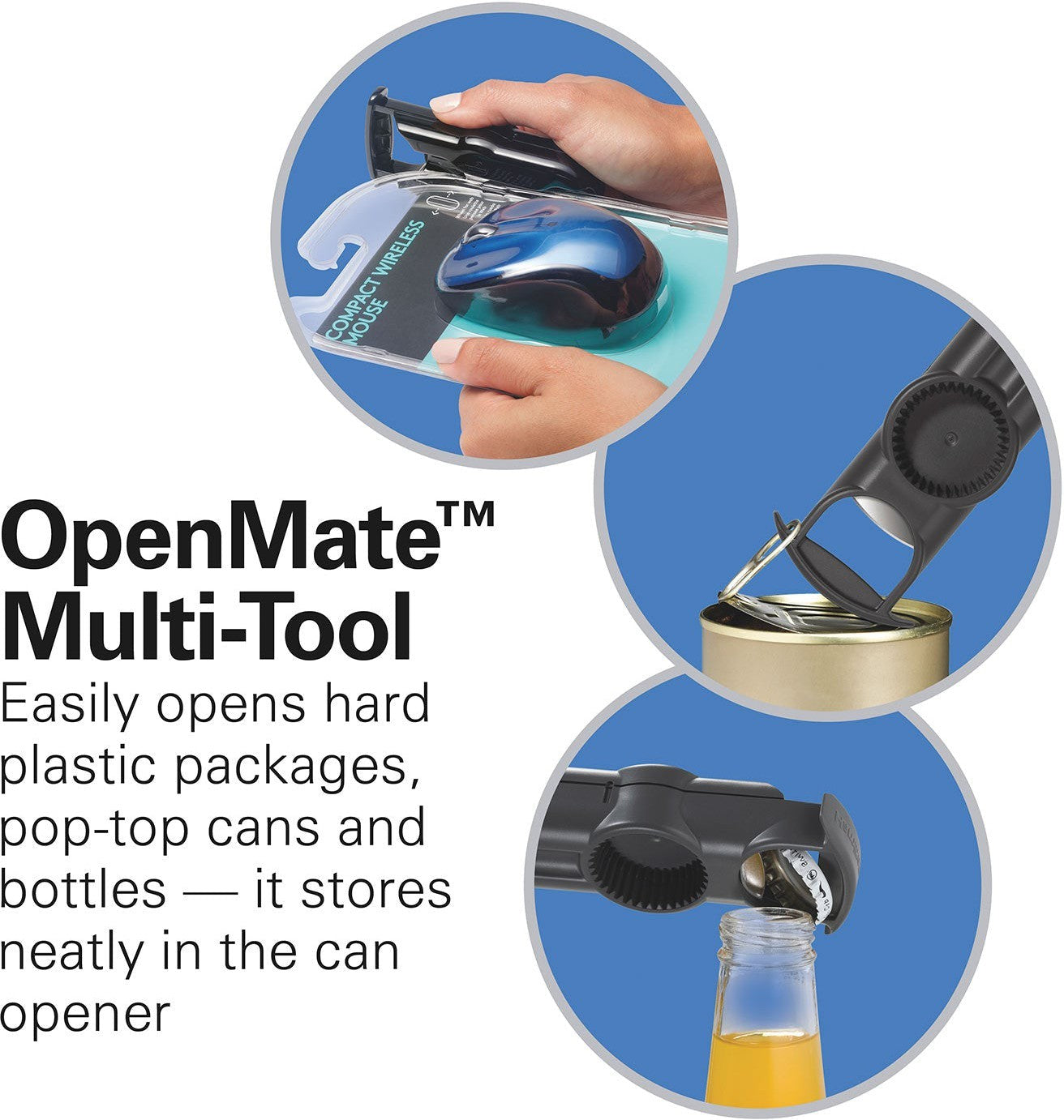 - OpenMate™ Multi-Tool: Included tool opens hard plastic packages, pop-top cans, and removes bottle tops and twist-off caps; conveniently stores in the front of the can opener.