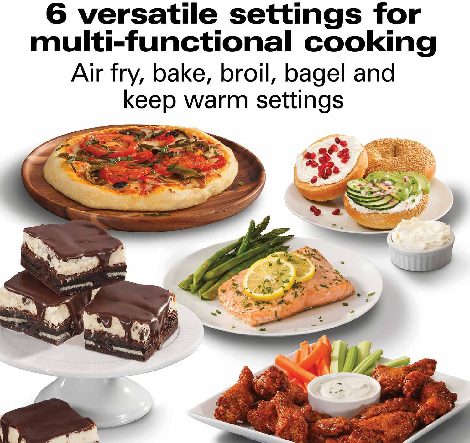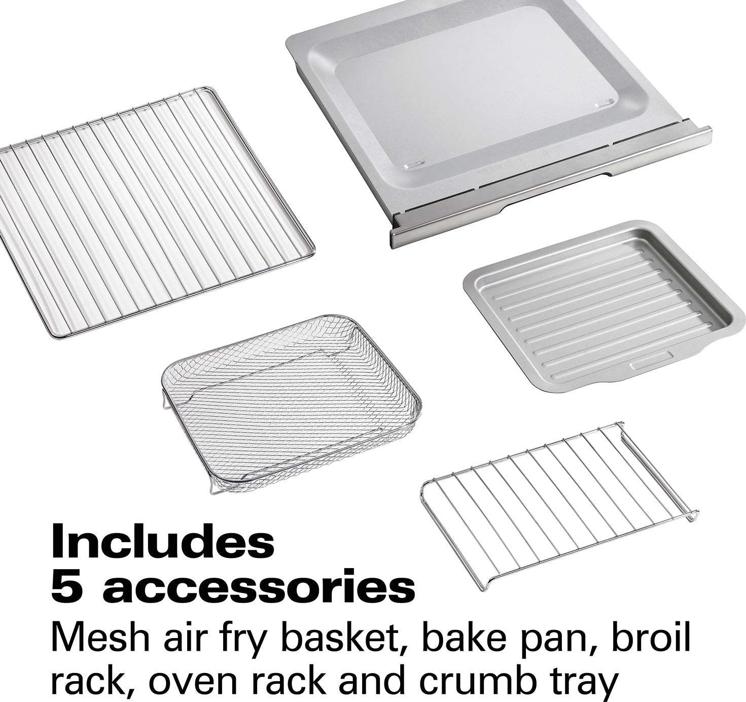 The Hamilton Beach® Professional Sure-Crisp® Air Fry Digital Toaster Oven combines excellent air fry, baking, and toasting performance in a compact, stylish package. This professional-quality toaster oven lets you expertly prepare everything from crispy chicken wings to filet mignon without heating up your entire kitchen. With 6 versatile settings, including air fry, bake, broil, toast, bagel, and keep warm, you can handle a wide range of cooking tasks. The compact size of this toaster oven air fryer saves valuable counter space while still offering the functionality of a full-size oven. It fits 4 slices of bread, a 10” pizza, or a 9” x 9” bake pan. The premium digital controls and quality quartz heating elements ensure precise temperatures and even heating without hot spots. After cooking, the nonstick interior makes cleanup a breeze, and the slide-out crumb tray helps discard bread crumbs easily. The toaster oven comes with a mesh air fry basket, bake pan, broil rack, removable oven rack, and removable crumb tray.