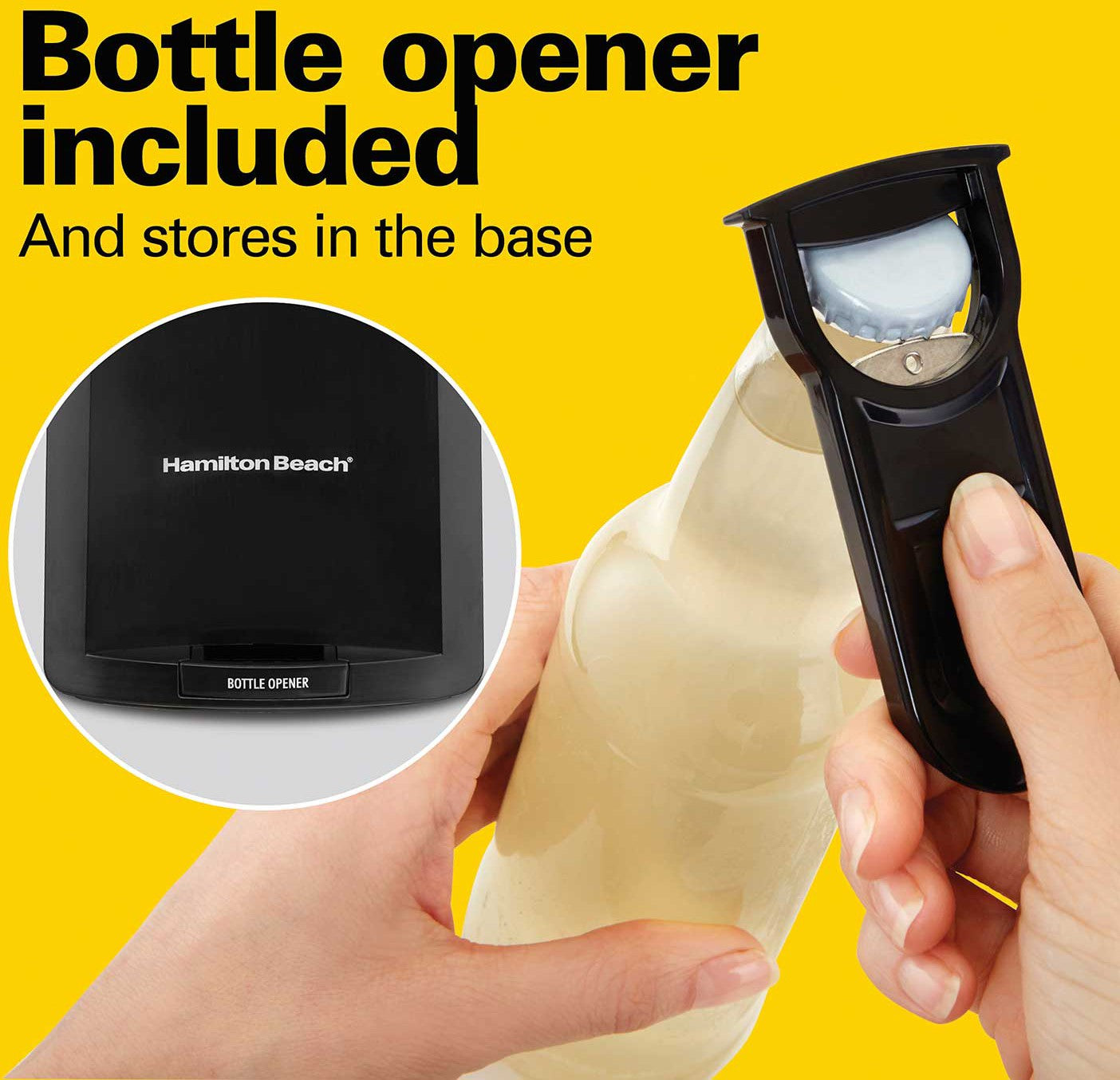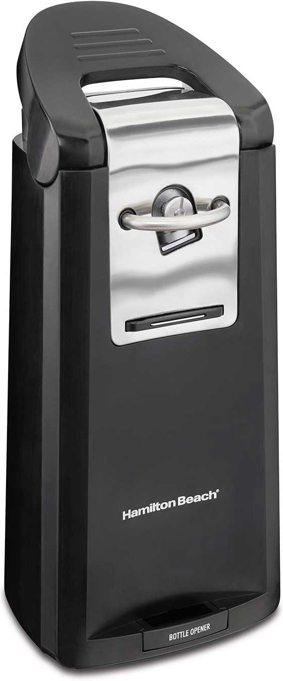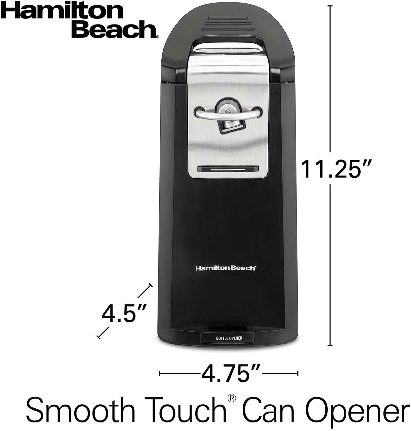 Effortlessly open cans of all sizes with the Hamilton Beach SmoothTouch Can Opener, featuring a sleek design and multiple functional capabilities. The Hamilton Beach SmoothTouch Can Opener is designed to simplify your kitchen tasks with its advanced SmoothTouch Technology, which ensures cans are opened cleanly along the side, leaving lids with smooth edges that are safe to touch. This innovative approach minimizes contact with food, preventing splashing and creating mess-free openings. Its extra-tall design allows you to effortlessly open cans of varying sizes, from small cans of tuna to large cans of vegetables or soups. The ergonomic push-down lever ensures smooth operation with a single motion, making it easy for anyone to use. Additionally, the can opener features a built-in knife sharpener on the back for keeping kitchen knives sharp and ready for use. For added convenience, a removable bottle opener is located on the front of the unit, ensuring it's always within reach whenever you need to open bottles. The cord storage area keeps the cord neatly tucked away when not in use, maintaining a clutter-free countertop. The Hamilton Beach SmoothTouch Can Opener combines functionality, ease of use, and a sleek design, making it an essential tool for any kitchen. Whether you're opening cans, sharpening knives, or opening bottles, this versatile appliance streamlines your kitchen operations with efficiency and style.