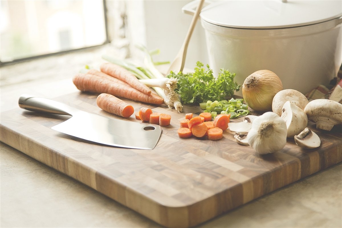 Besides being beautiful, end grain boards have even more advantages-both practical and cost-effective. Unlike traditionally made boards, end grain construction is less dulling to cutlery because the wood grain direction accommodates cutting instead of resisting it (as the knife cuts, it slides into the direction of the grains instead of against them). Wear and tear is minimized on both cutlery and on the board, giving more longevity to all your cutting tools.