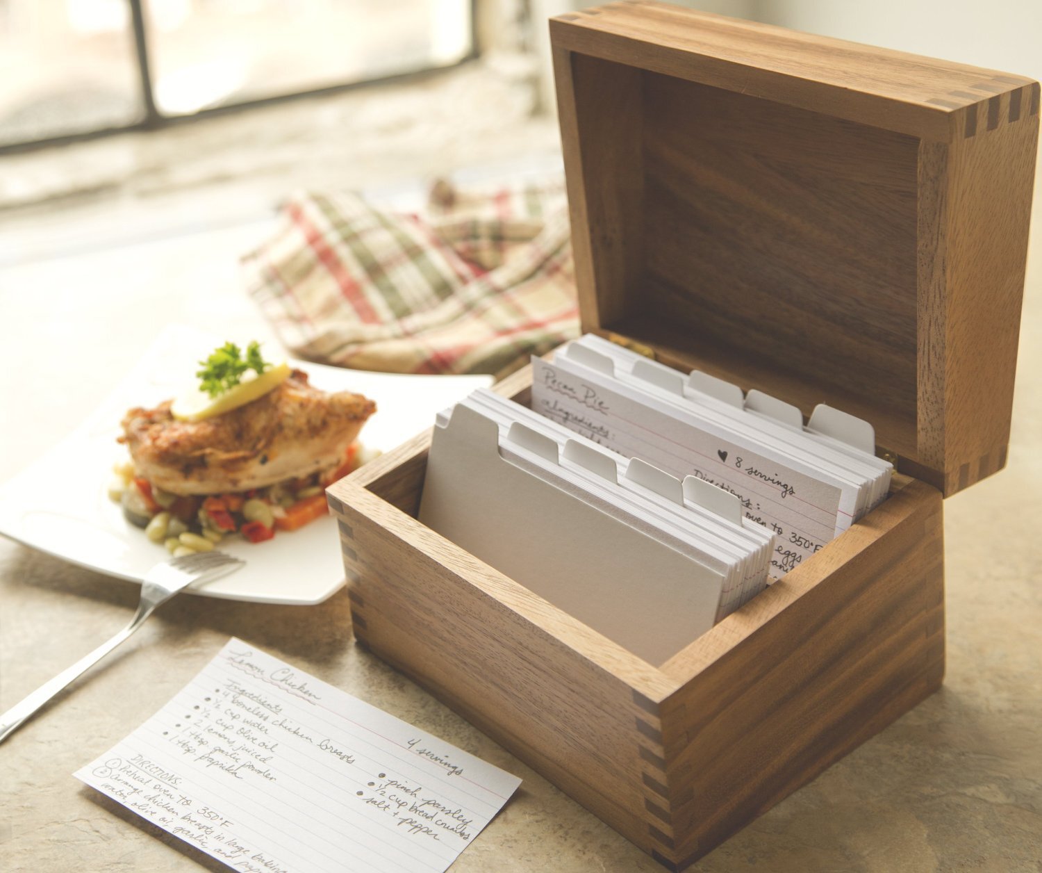 Perfect for 6" x 4" recipe cards. The slot on the top of the box will hold recipe card for easy use.