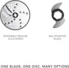 Everything from cucumbers to tomatoes, cheeses and more with the reversible medium slicing/shredding disc and multi-purpose blade.