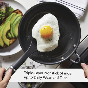 PRECISE HEAT DISTRIBUTION: Five layers of heat conductive metal from base to rim deliver precise heat control and superior heat retention throughout entire frying pan.