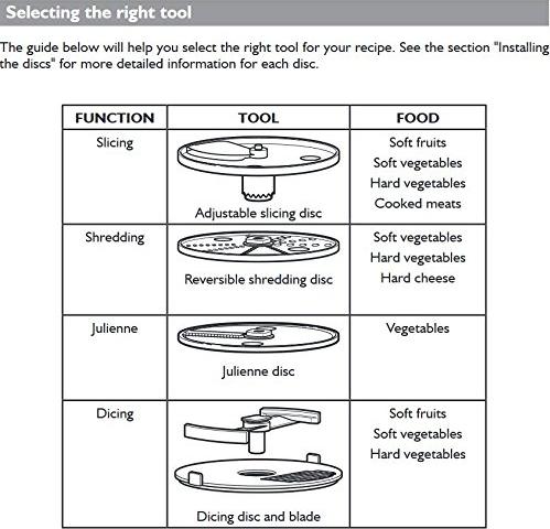 Contains: Reversible Shredding Disc, Julienne Disc, Adjustable Slicing Disc, Dicing Disc And Blade, Dicing Disc Cleaner, Case And Disc Adapter.
