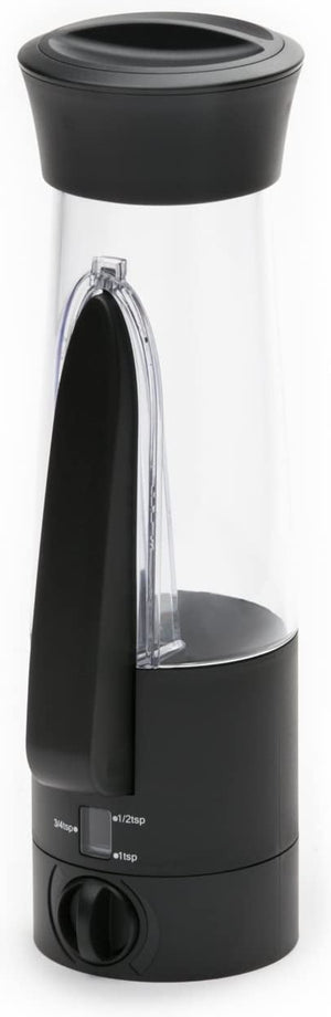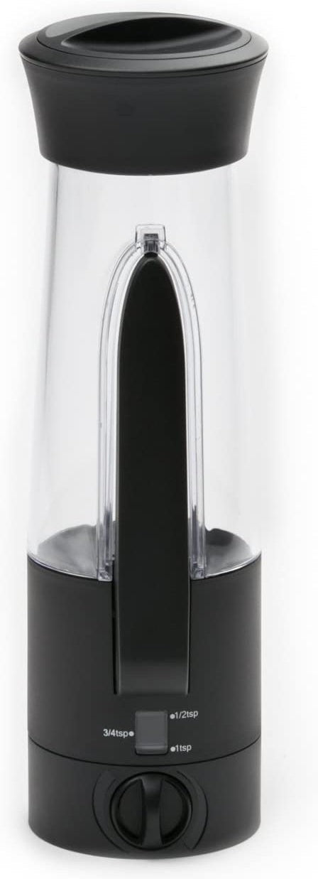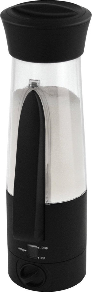 Dial adjusts to 1/2 teaspoon, 3/4 teaspoon and 1 teaspoon. Accurately measures with a press of the lever. Shakes and pours on top.