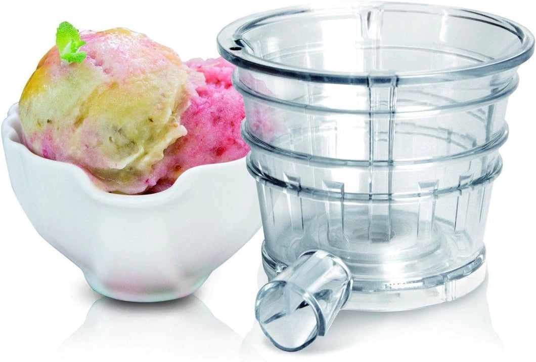 Switch out the strainer with the blank strainer to make delicious frozen desserts with your favorite fruits.