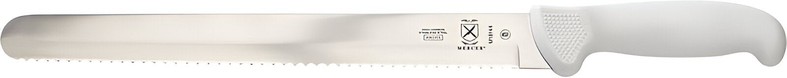 What sets this knife apart is its wavy edge feature, boasting teeth along the blade edge. This unique design allows for effortless penetration through tough outer crusts or skins of various foods while safeguarding the delicate inner parts from tearing, ensuring precise and clean slices every time. Additionally, the knife comes with a protective finger guard, further enhancing safety in the kitchen. Whether you're slicing meats, fruits, or vegetables, the Mercer - 12" Japanese Steel Wavy Edge Slicer Knife is the ultimate companion for achieving professional-quality results with ease and confidence. Elevate your culinary prowess with Mercer.