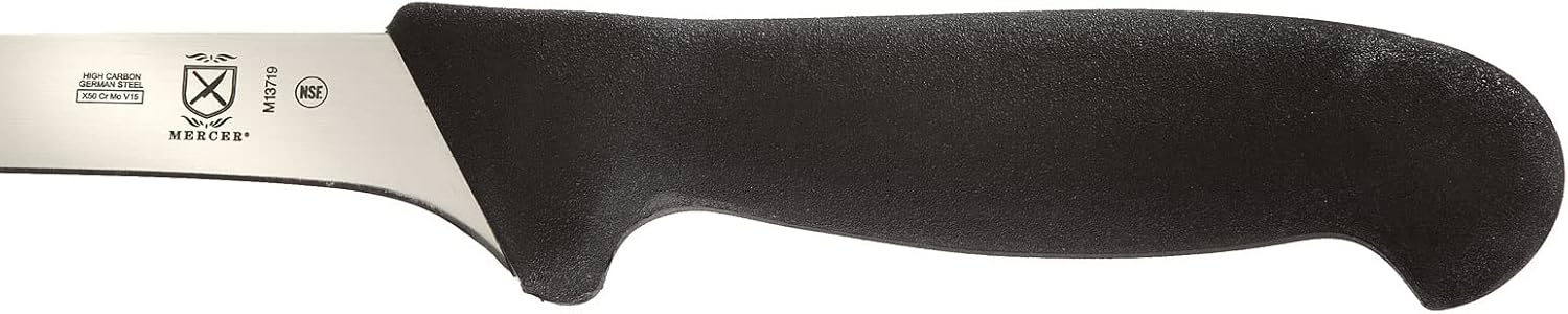 The Mercer - BPX® 8.5" German Steel Narrow Fillet Knife with Black Handle, a premium tool designed for precision and durability in your kitchen endeavors. Crafted from high-carbon German steel, this fillet knife boasts exceptional strength and resilience. The steel undergoes ice hardening, enhancing its durability and ensuring that the blade retains its sharpness through extensive use. Equipped with a textured, ergonomic glass reinforced nylon handle, this knife provides a secure grip and unparalleled durability. The handle design ensures comfort and control during prolonged use, making it ideal for intricate filleting tasks. The mirror-finished blade not only adds an aesthetic appeal but also facilitates smooth cutting and effortless release of ingredients. With its taper-ground edge, this knife maintains long-lasting sharpness and allows for easy honing, ensuring consistent precision in every cut. Additionally, a protective finger guard enhances safety during use, offering added peace of mind in busy kitchen environments. Experience the ultimate combination of performance and reliability with the Mercer - BPX® 8.5" German Steel Narrow Fillet Knife with Black Handle, your indispensable tool for culinary excellence.