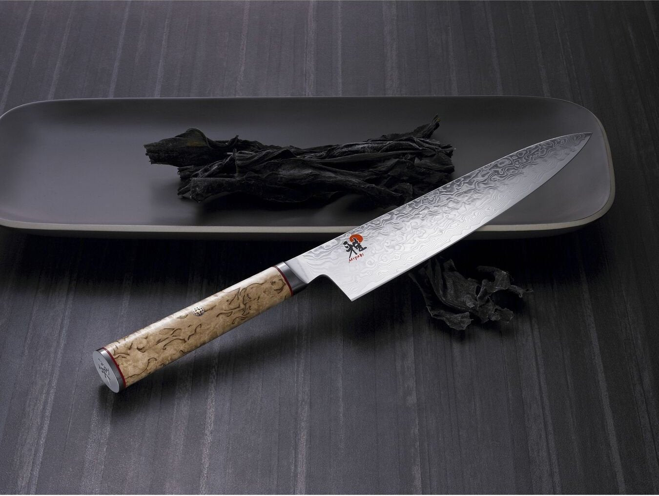 Top-of-the-line MIYABI Birchwood is a work of culinary art. Both blade and handle are crafted from the most precious materials, which shape their striking appearance. More than meets the eye, the potent core of SG2 micro-carbide powder steel is protected by 100 layers of steel. MIYABI's innovative, ice-hardening process locks in the long-lasting sharpness of the CRYODUR blades. Beneath its beautiful exterior, the flower Damascus pattern provides added durability. The scalpel-like blade is complemented by an equally striking Karelian (Masur) Birch handle. A prized material for knife handles, Karelian Birch is also the only wood ever used in a Faberge egg. Exquisite and ergonomic, MIYABI Birchwood knives feel as good as they look. Handcrafted in Seki, Japan.