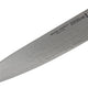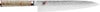 The blade has beautiful Damask patterning and a hard core of MicroCarbide MC63 powder steel enclosed within 100 layers of two different steels. The CRYODUR blade is ice-hardened at -196 degrees Celsius to achieve a hardness rating of around 63 Rockwell that keeps the blade sharp and flexible. The blade also undergoes manual Honbazuke honing between two rotating stones to achieve its extreme sharpness, and is then polished using a leather wheel. This Miyabi knife has both beauty and functionality.