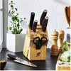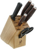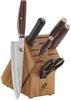 MIYABI celebrates Japanese craftsmanship with Artisan. Using traditional methods and innovative techniques, these knives merge the past and present into an exceptional knife collection. The potent core of SG2 micro-carbide powder steel is layered in a Tsuchime (hammered) finish. This exquisite, hand-hammered effect helps prevent food from sticking. Each knife features a hand-honed blade finished with a true katana edge, a homage to the samurai swords made in Seki centuries ago. Fabricated with special Cocobolo Rosewood pakkawood, the handles mirror the beauty of the blade. Sophisticated details include brass and red spacers, a mosaic pin and a stainless steel end cap. The attractive D-shaped handle is designed to nestle comfortably in your hand for tireless cutting. Handcrafted in Seki, Japan. Set Includes 3.5" Paring Knife, 7" Santoku Knife, 8" Chef Knife, 9" Bread Knife, 9" Honing Steel, Shears and Bamboo Block.