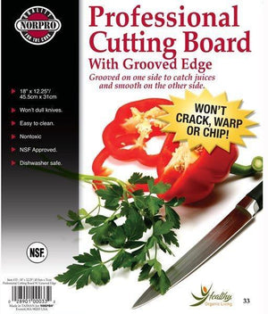 Grooved on one side to catch juices and smooth on the other side. Has a convenient handle. Approved for commercial and industrial use. Made of Polyethylene. NSF approved. Dishwasher safe.
