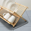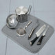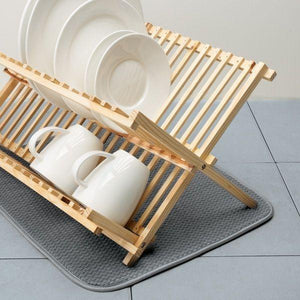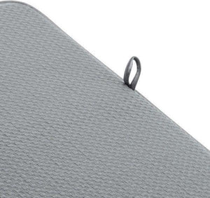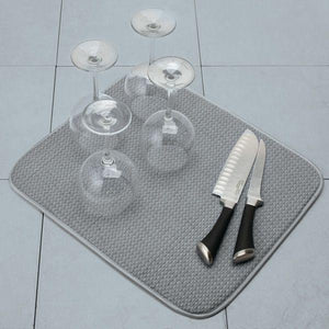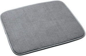 The perfect solution for every kitchen countertop! Ideal to replace dish towels on the counter when handwashing pots, pans, dishes, glassware and cutlery! This unique design holds 4 times its weight in water by combining a thin layer of foam between two high quality, extremely absorbent, durable, microfiber layers. Dries faster than ordinary dish towels. Provides cushion for delicate dishes and stemware. Protects your counter from scratches and scuffs when placed under small appliances. Includes a sewn in hangtab to the side of the mat, to hang up mat to dry. Can also be folded for easy storage.